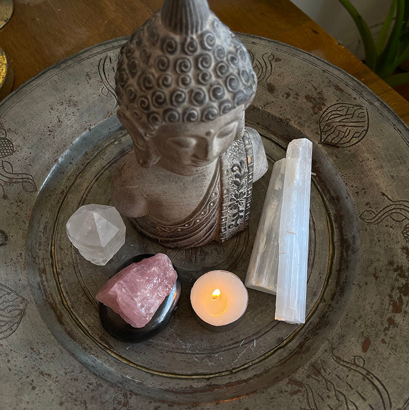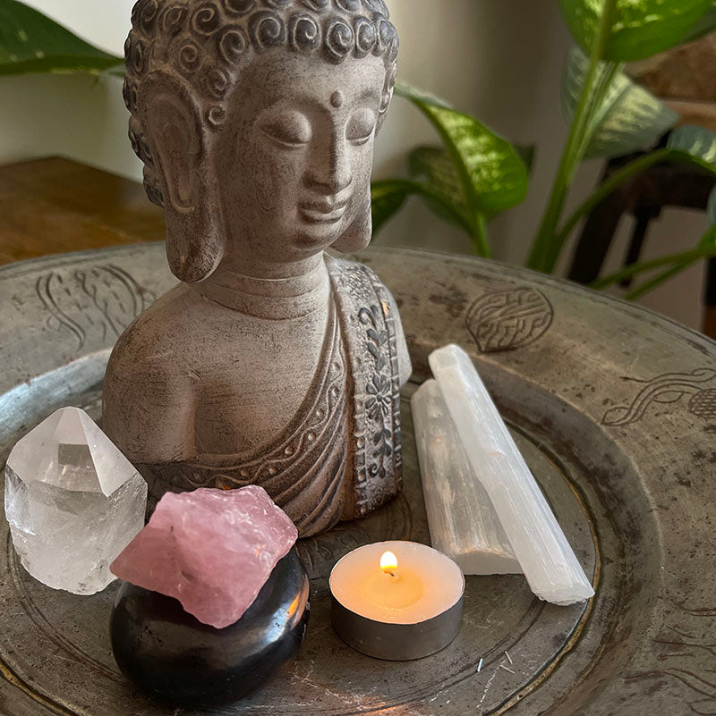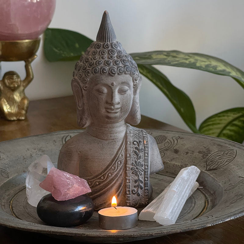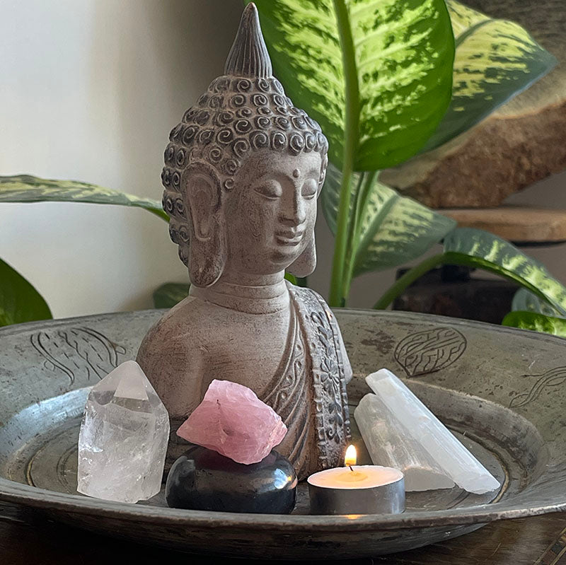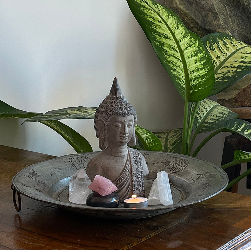 Eski bakır bir tabak içerisinde, kil ile tasarlanmış Buda heykeli, yanında Şingut, Kristal Kuvars, Selenit ve Pembe Kuvars kristalleri.