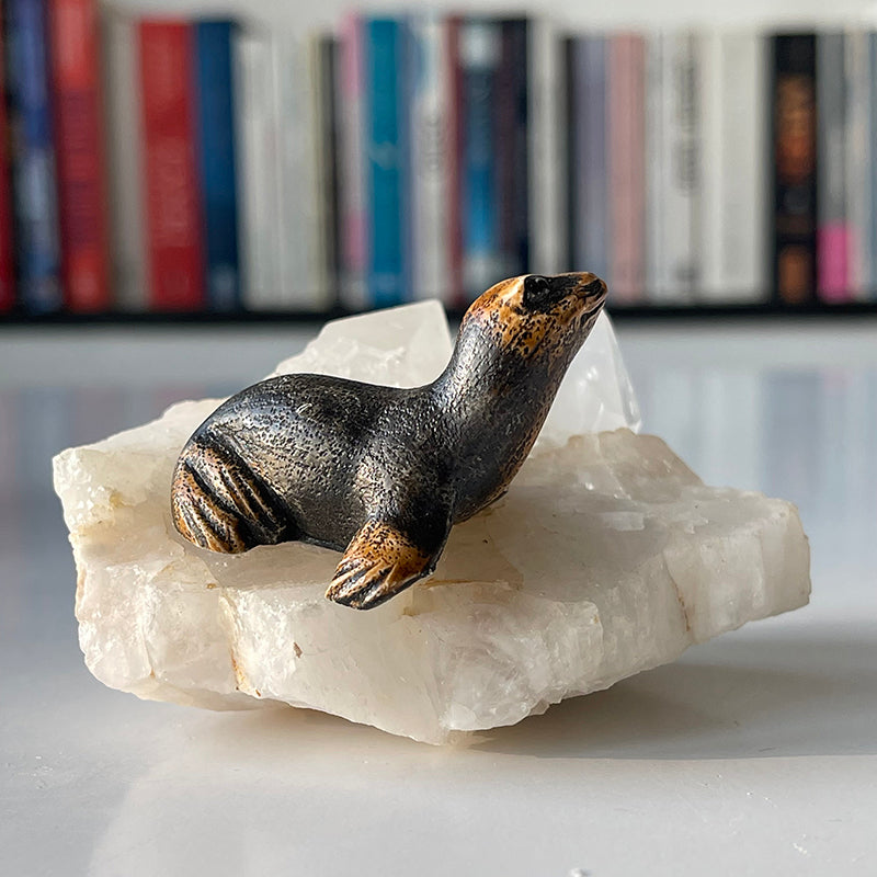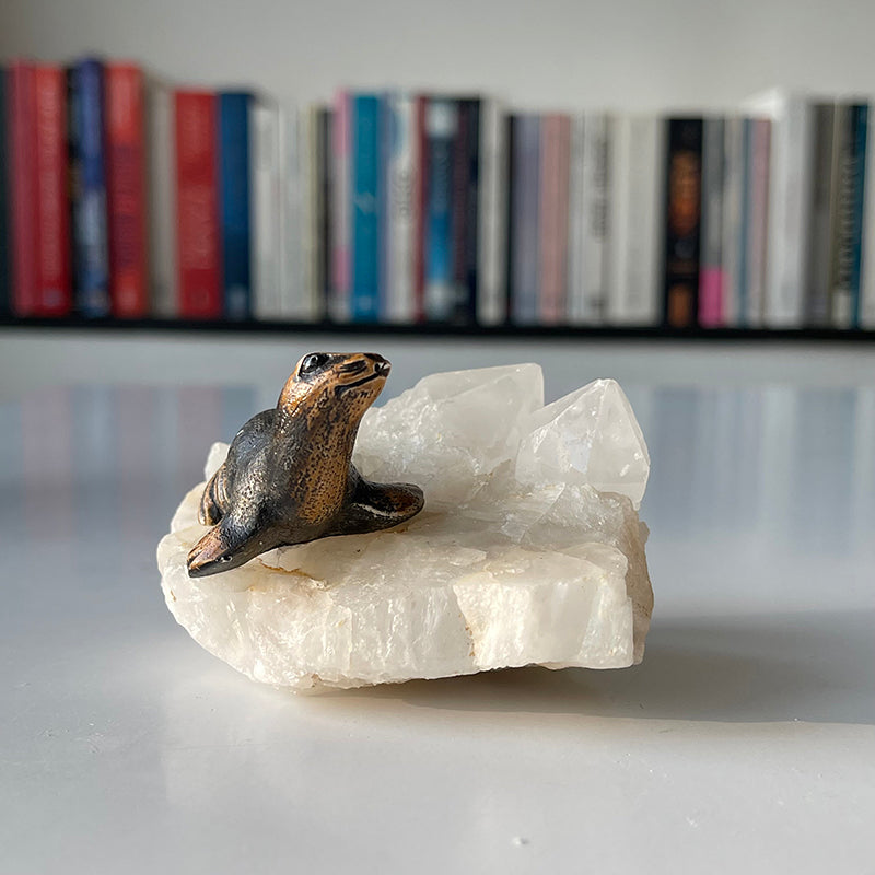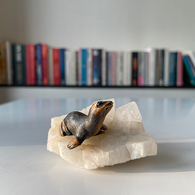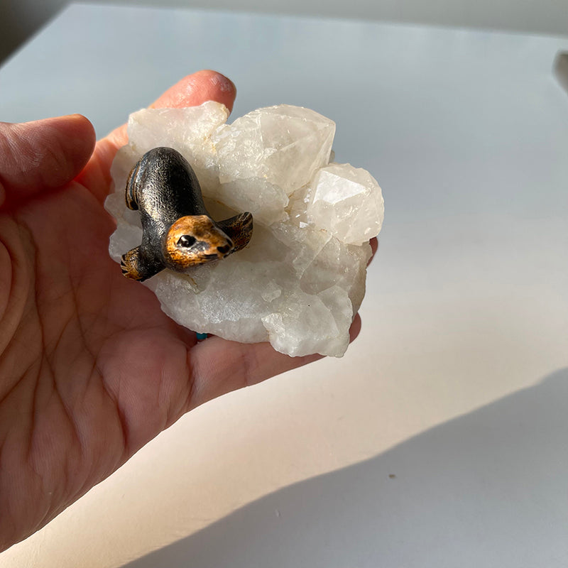 Kristal Kuvars ile hazırlanmış ve ustaca oyulmuş ahşap deniz aslanı figürü ile süslenmiş bu eşsiz parça, bir huzur ve korunma duygusu yayar.