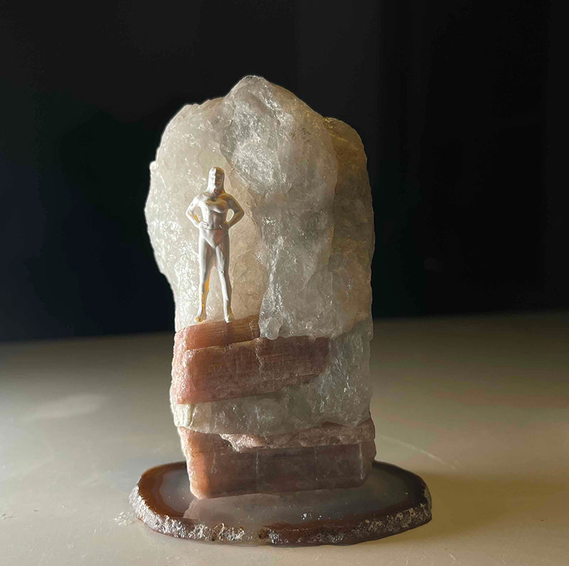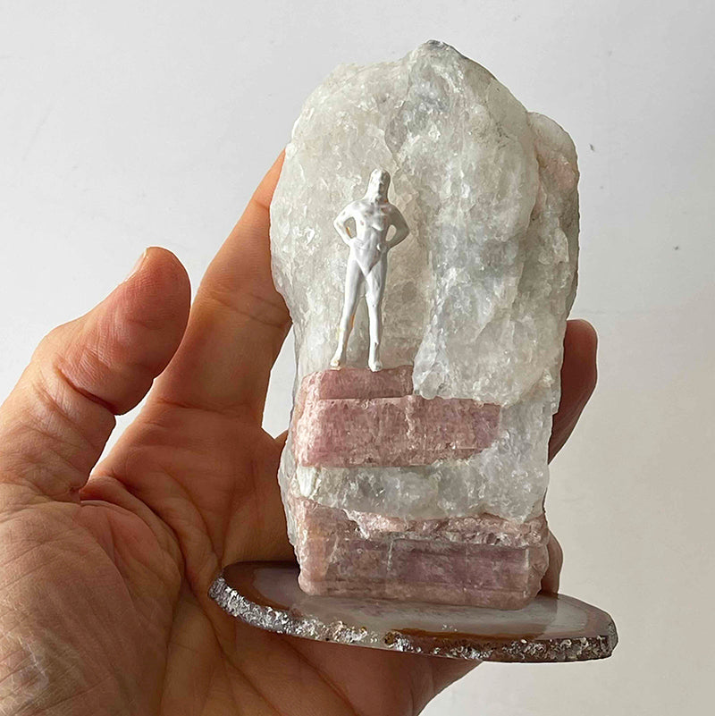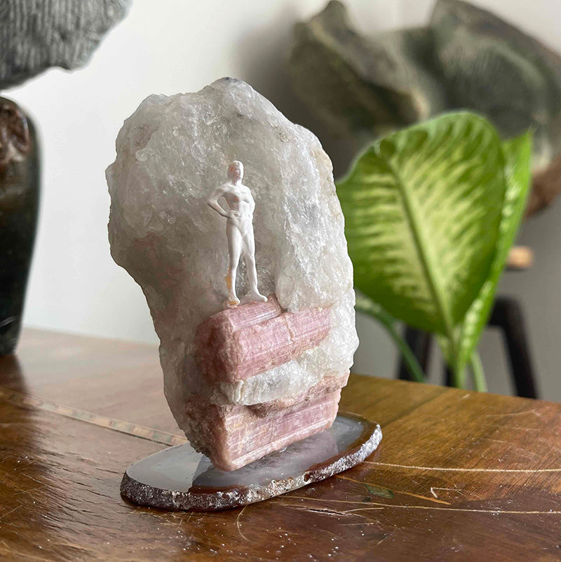 Akik kristali üzerinde iri bir Pembe Turmalin ve üzerinde dimdik duran bir kadın figüründen oluşan bu çalışma, yaşamın zorluklarına meydan okuyan güçlü bir ruhu temsil ediyor.