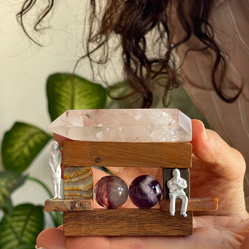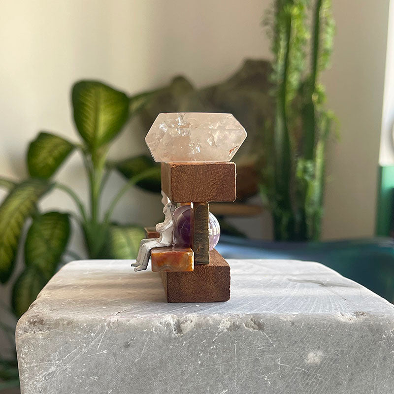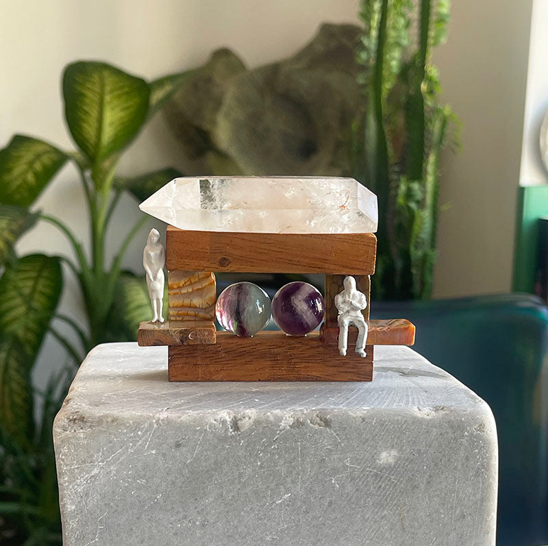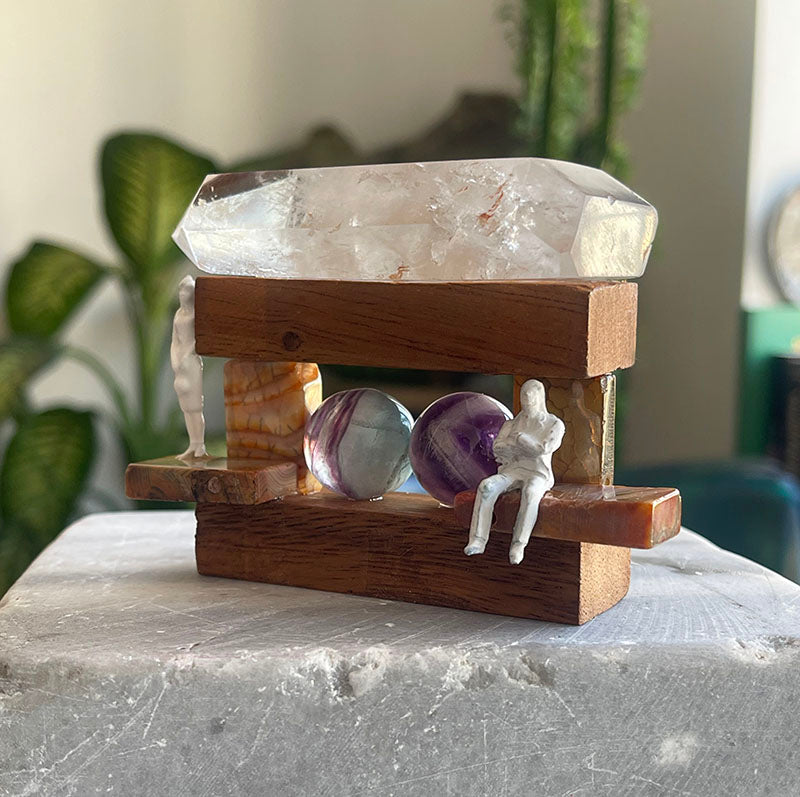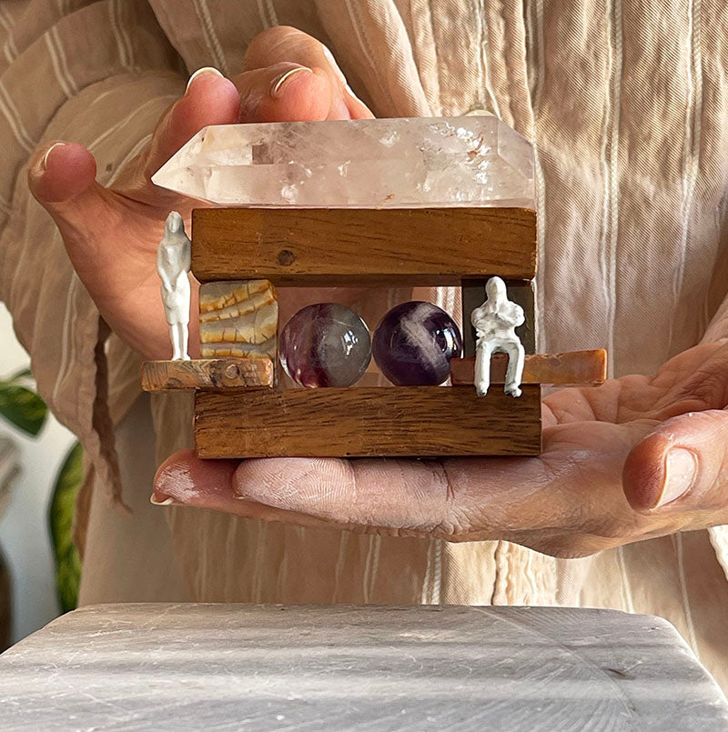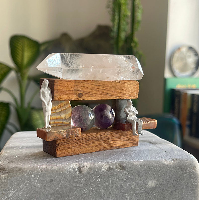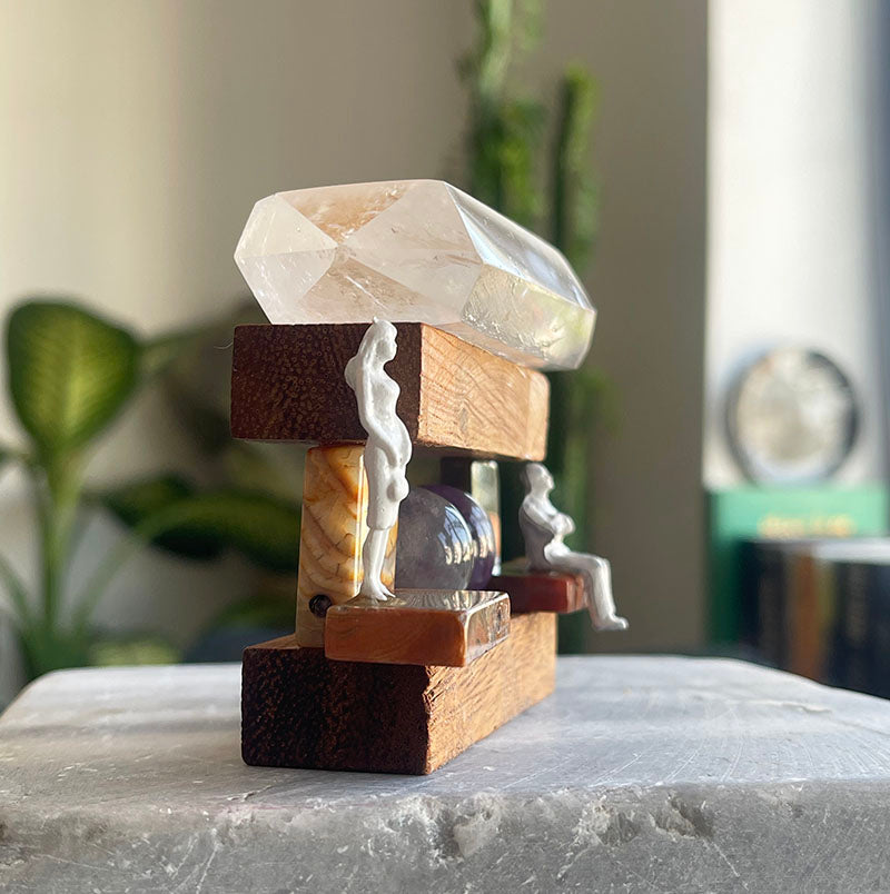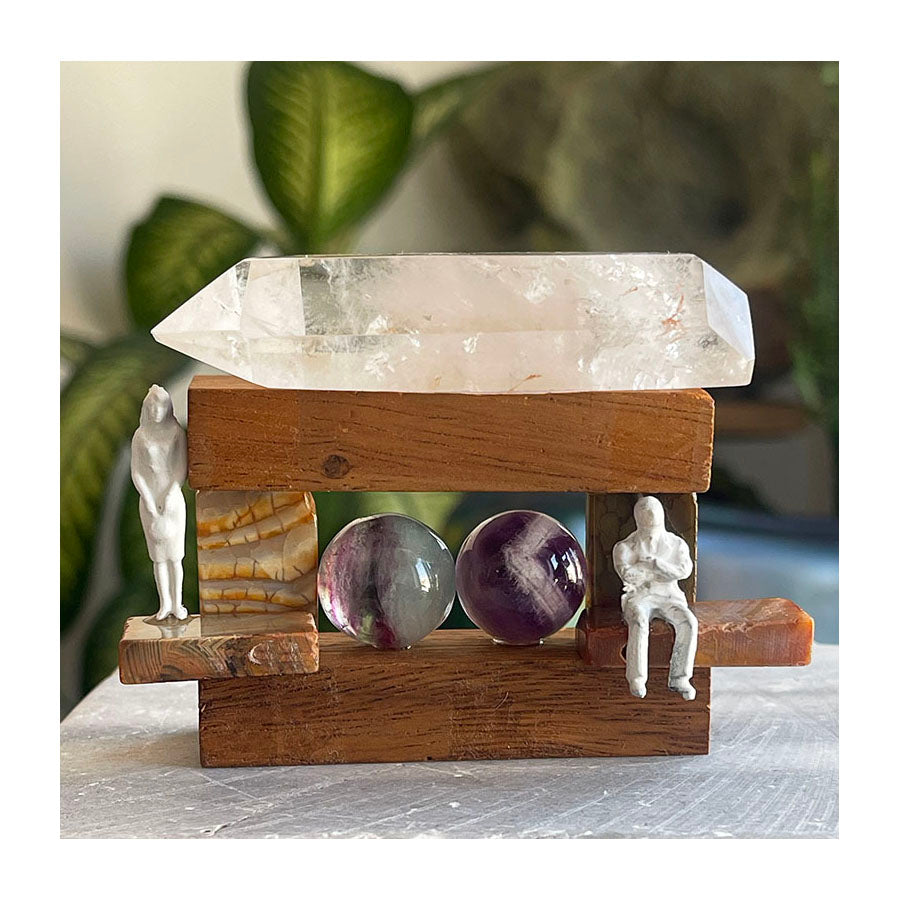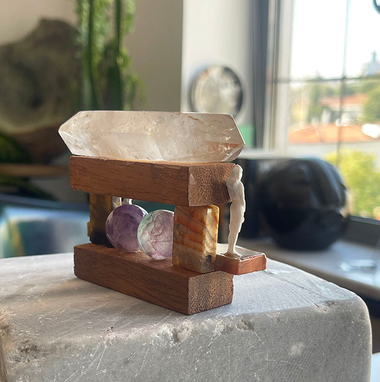 Bu çalışma, ahşap bloklar ve kristal taşların ahenkli birleşimi ile sembolik anlamı derin bir tasarım sunar.