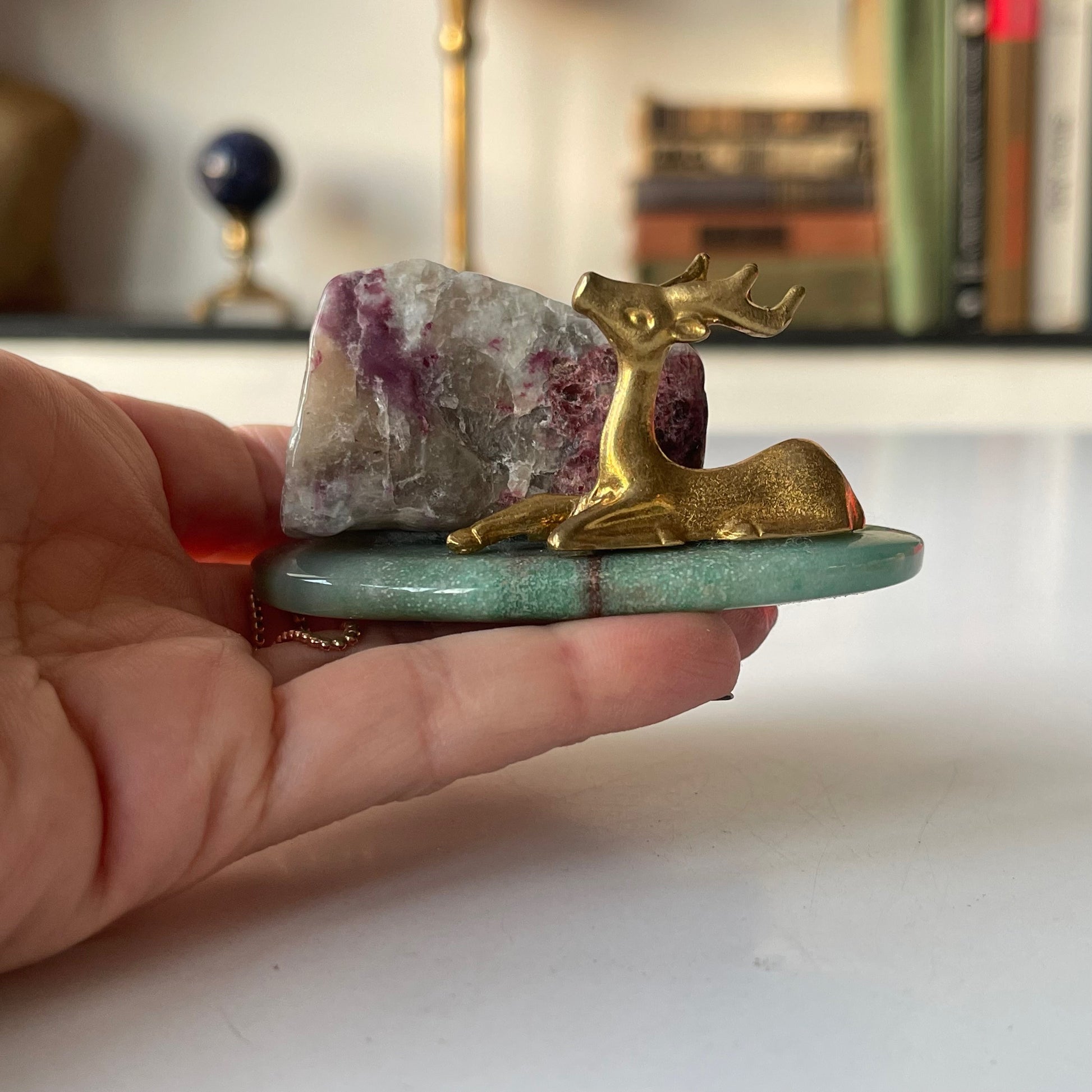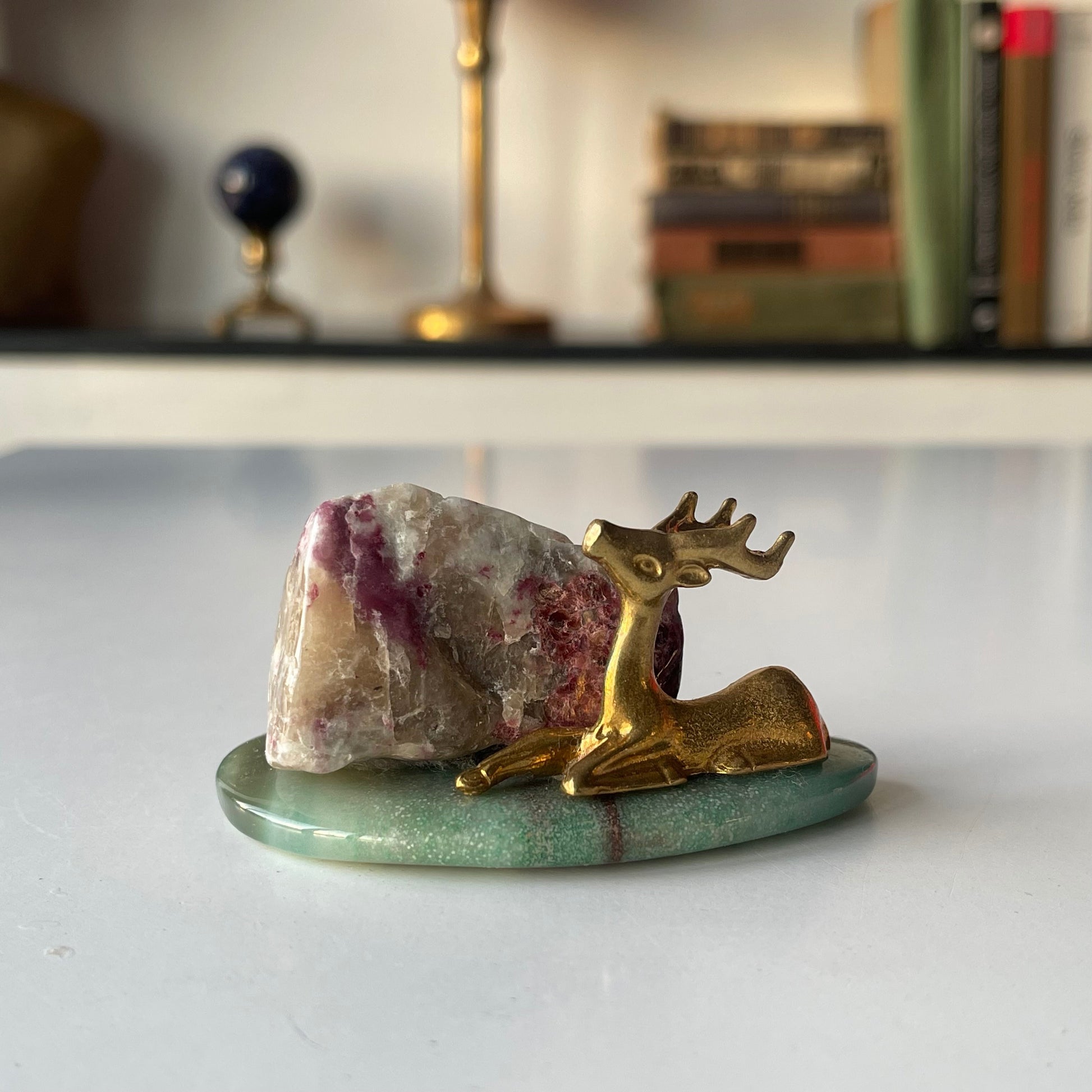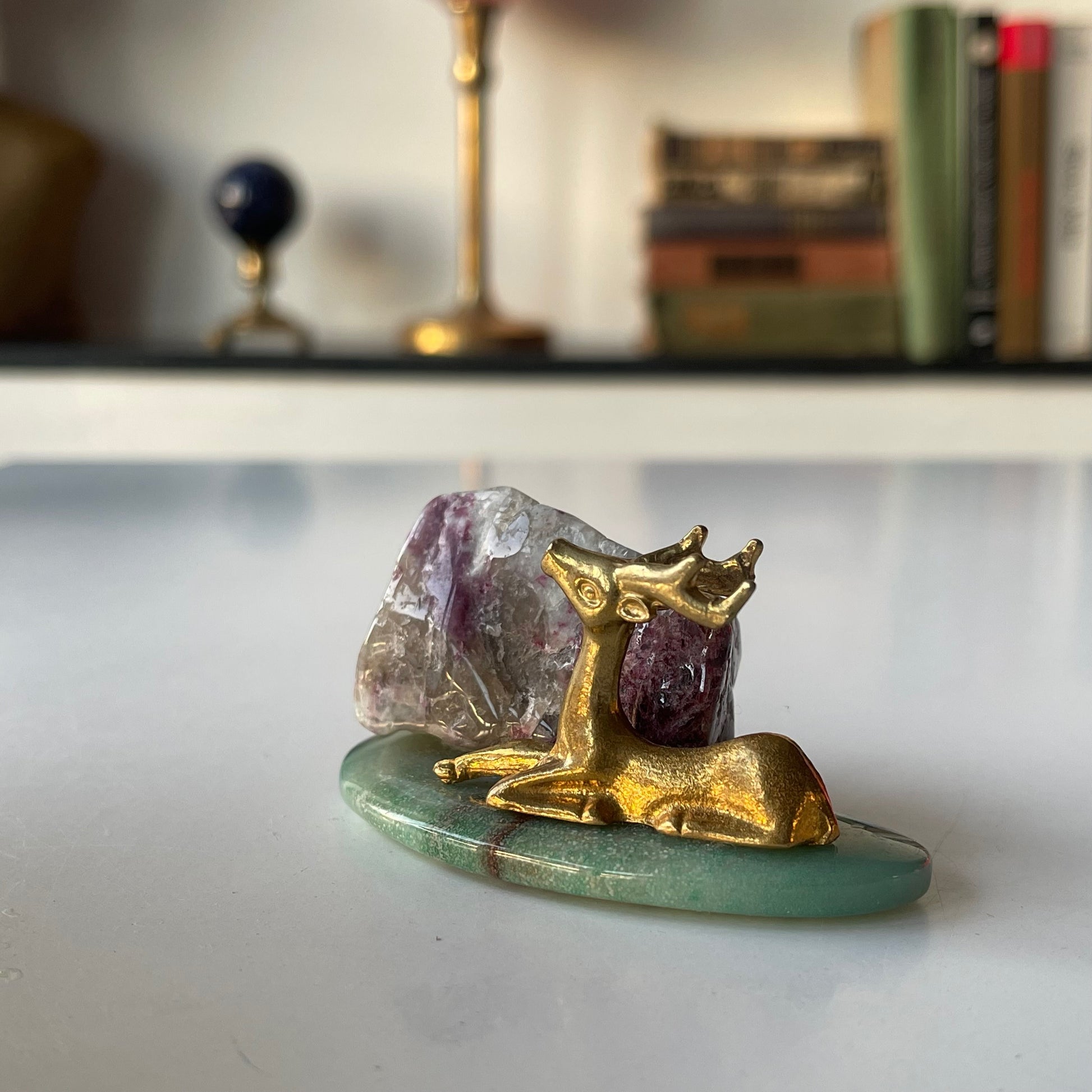 Ev dekorasyonunuzu doğadan ilham alarak dönüştürmeye ne dersiniz? Bu özel tasarım  yeşil Akik taşı, Turmalin kristali ve pirinç geyik figürü ile hazırlandı..