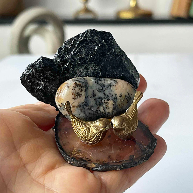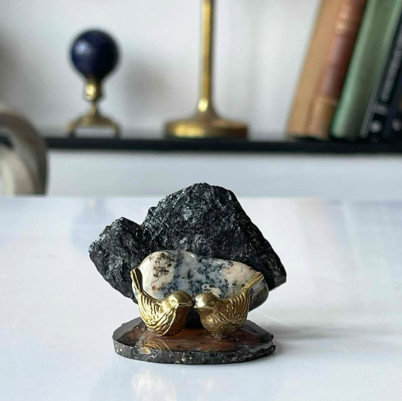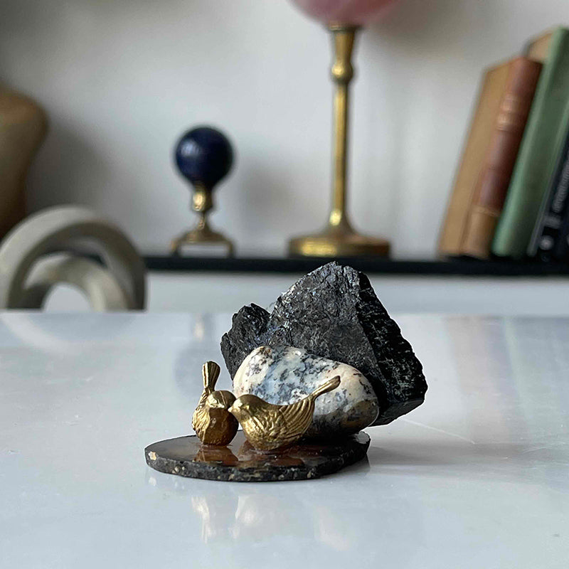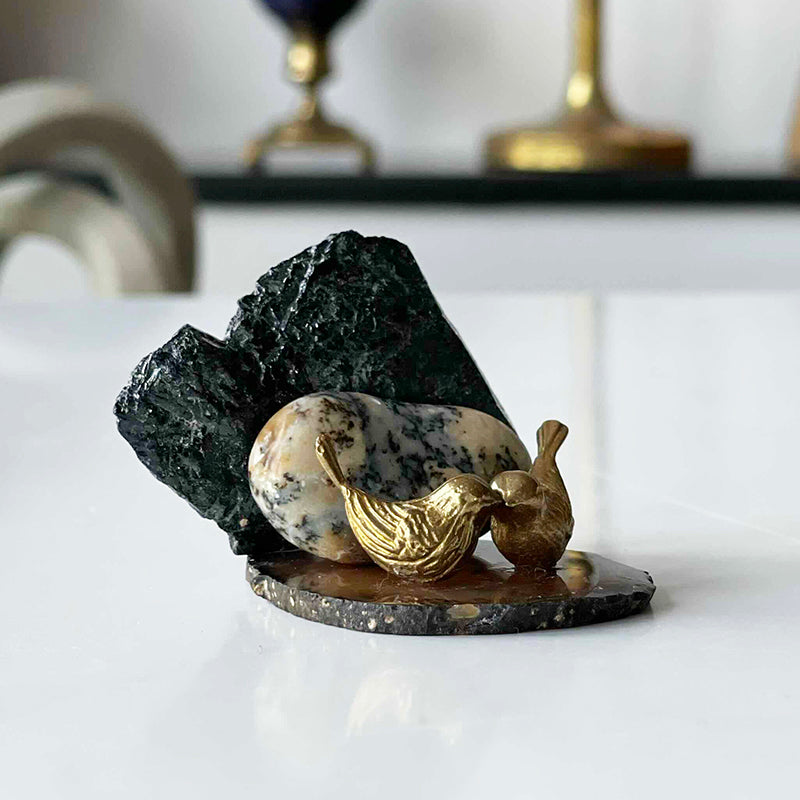 Siyah Turmalin'in fon olduğu çalışma iki kuşun aşkına şahit oluyor. Turmalin'in önündeki Opal, doğanın natürel dokusunu simgeliyor. Altlarındaki ışık geçirgenliği olan Akik kristali ise, renkleri itibariyle toprak ananın sembolü.