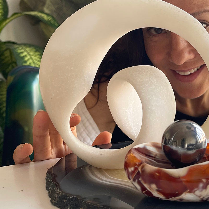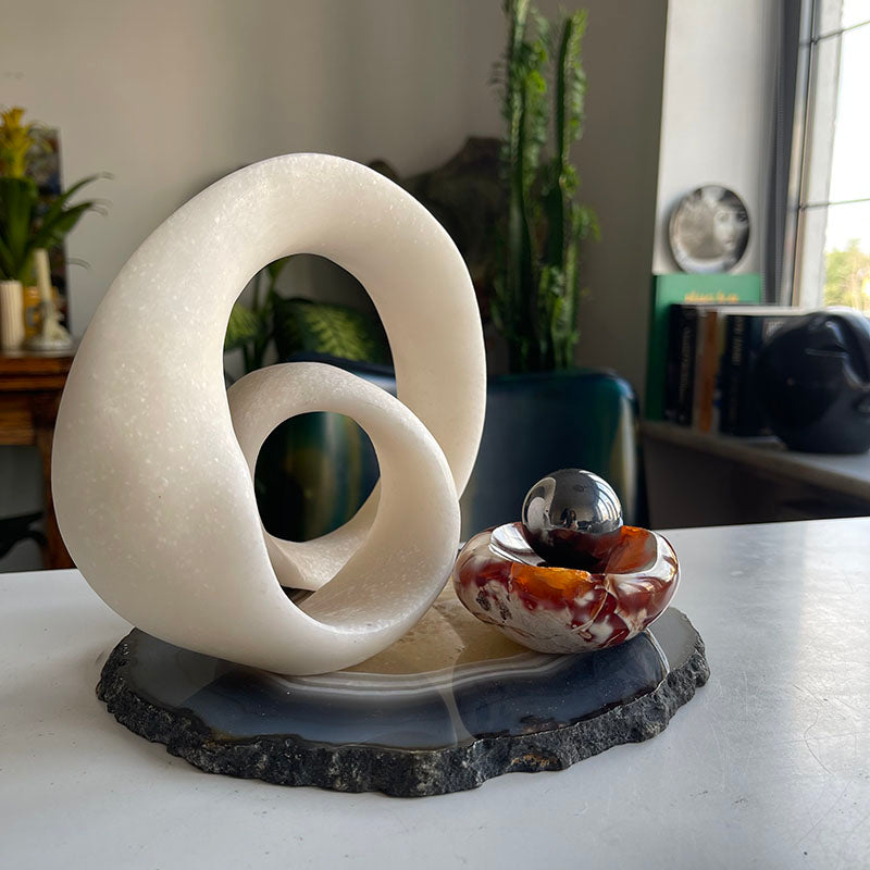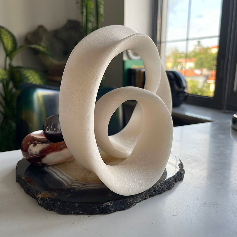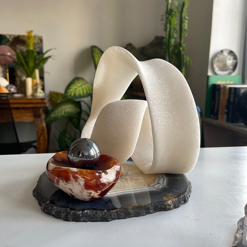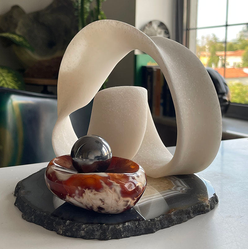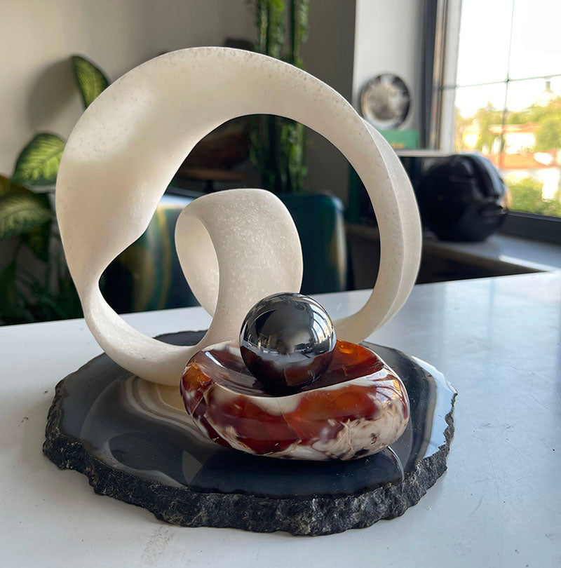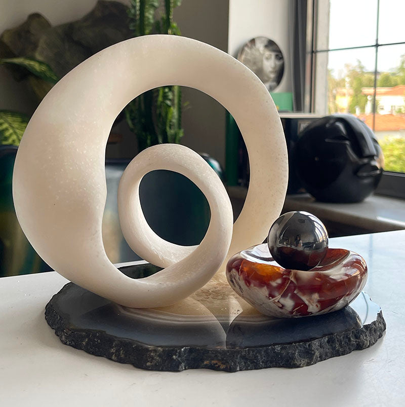 Etkileyici Akik Kristali üzerinde spiral formda bir heykel ve Karnelyan kase içerisinde Terhertz küreden oluşan bu tasarım, yaşamın döngüsünde kendi hareketimizi ve devinimimizi yaratma yeteneğimizi ifade eder.