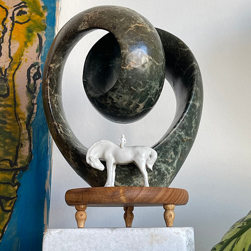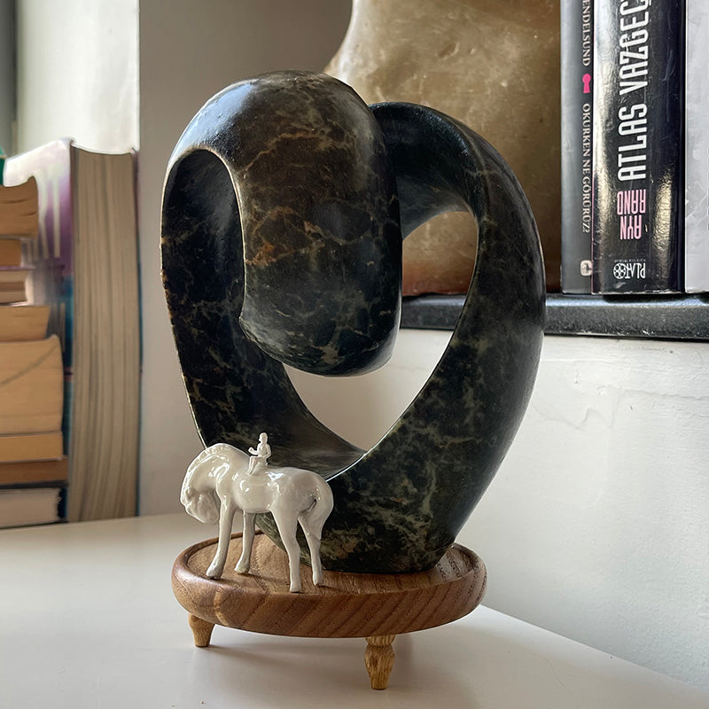 Üç ayaklı, zarif ahşap kaide üzerine yerleştirilmiştir. Kaidede aynı zamanda porselen at ve atın üzerinde bir kadın figürü yer alır. Kadın, alışkanlıklarını ve kalıplarını yeniden değerlendirerek, yaşam döngüsünün pasif izleyicisi olmak yerine, aktif bir yöneticisi olmayı seçmiştir.