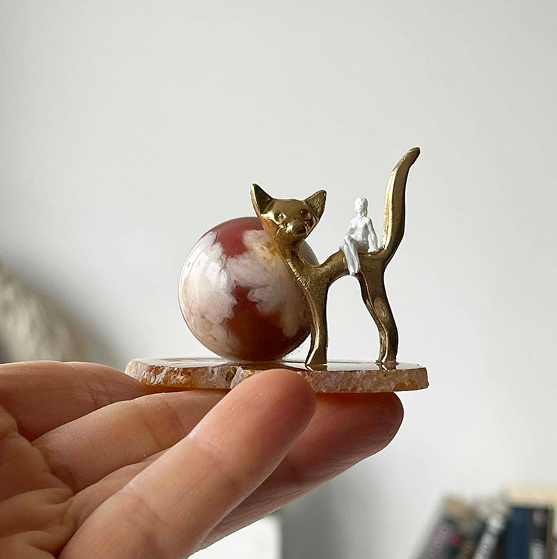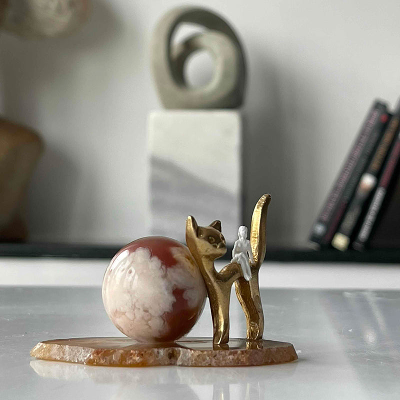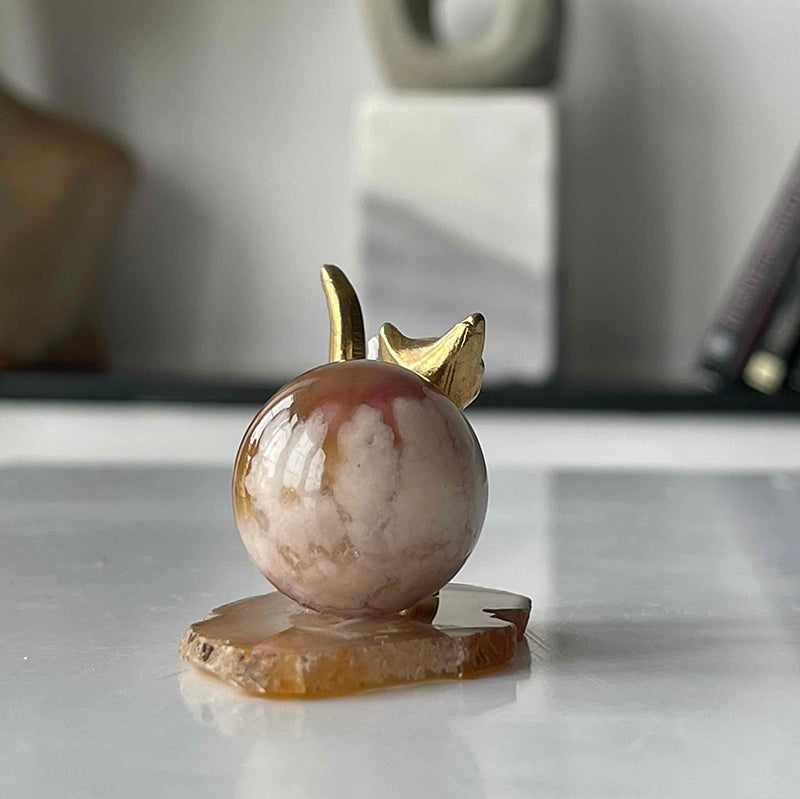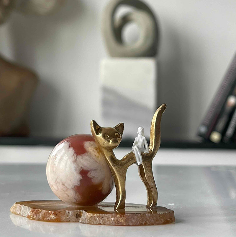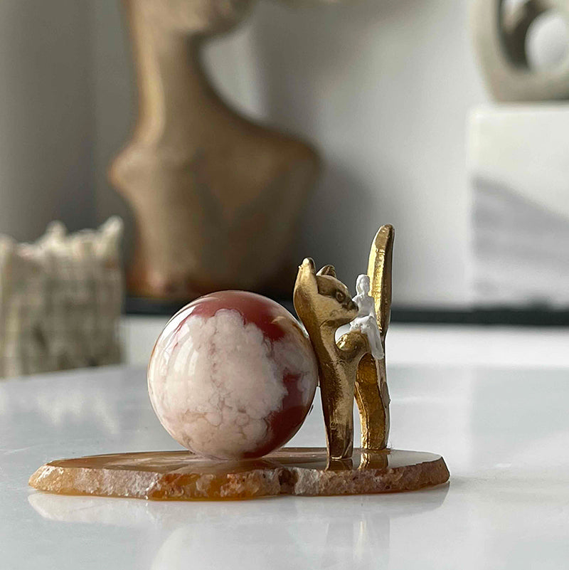 Akik kristali üzerinde yine küre formunda Akik ve yanında pirinç kedi figürü ile üzerinde oturan bir kadın. Bu çalışma dostluğun sembolü ...