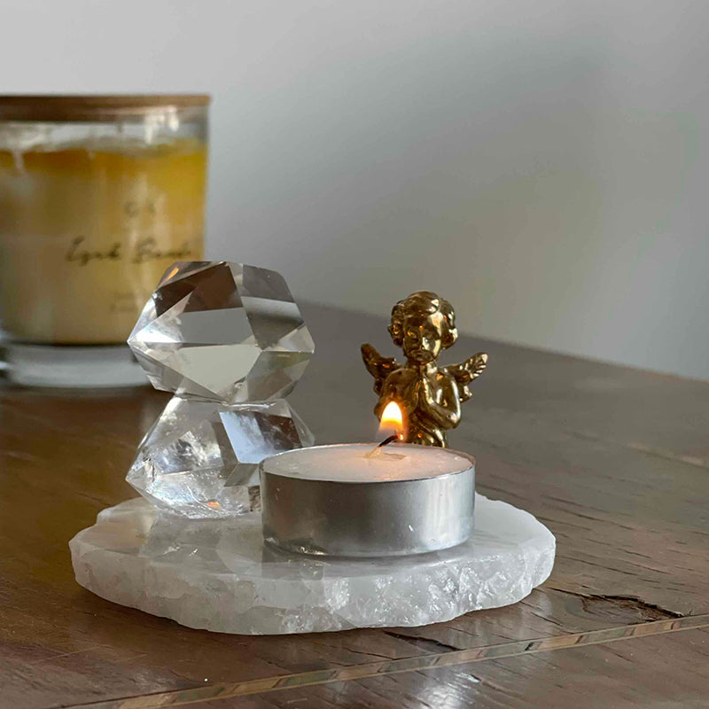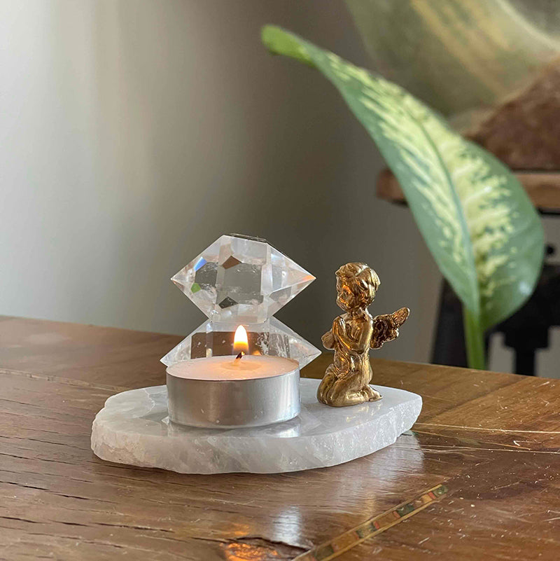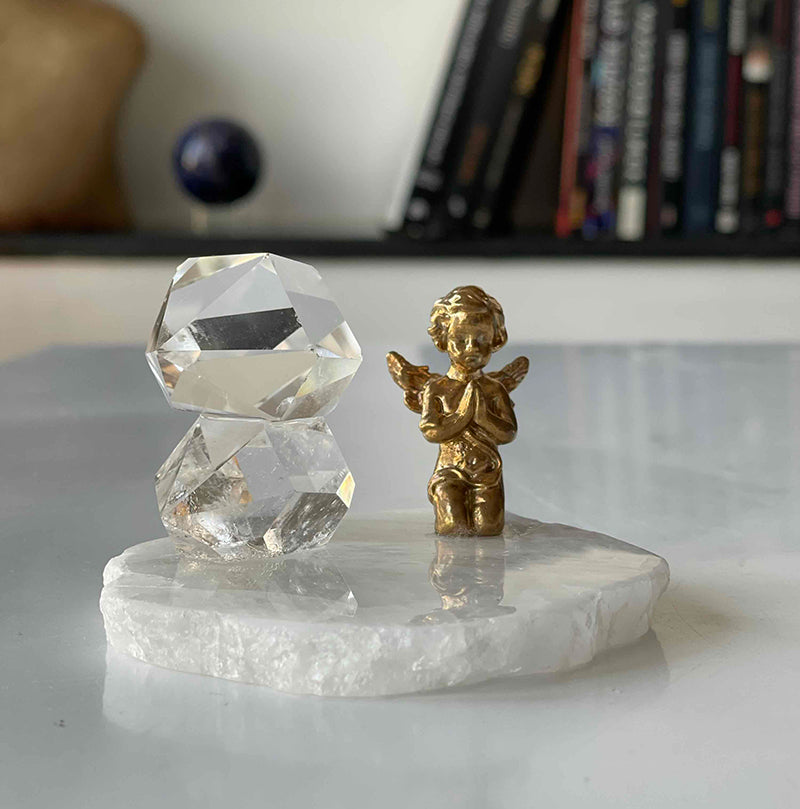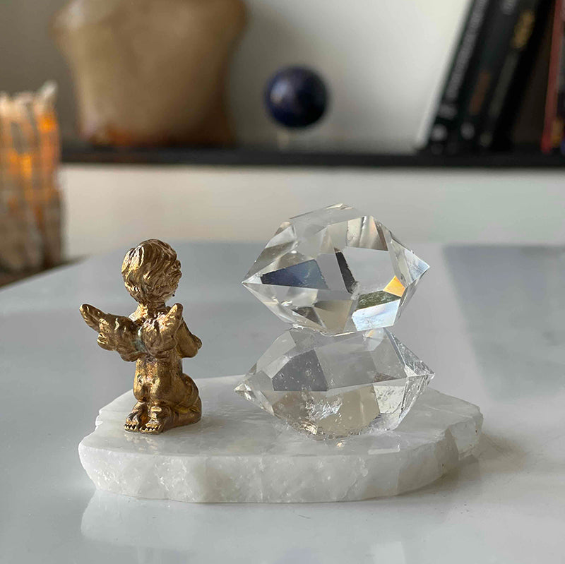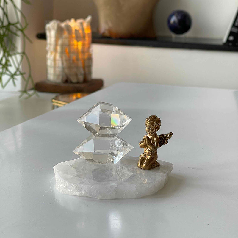 Kristal Kuvars tabaka üzerinde çift uçlu Kristal Kuvarslar. Yanlarında dua eden pirinç melek figürü ile.