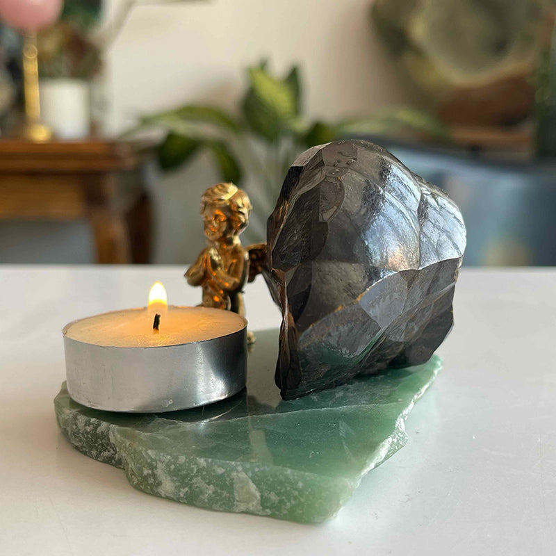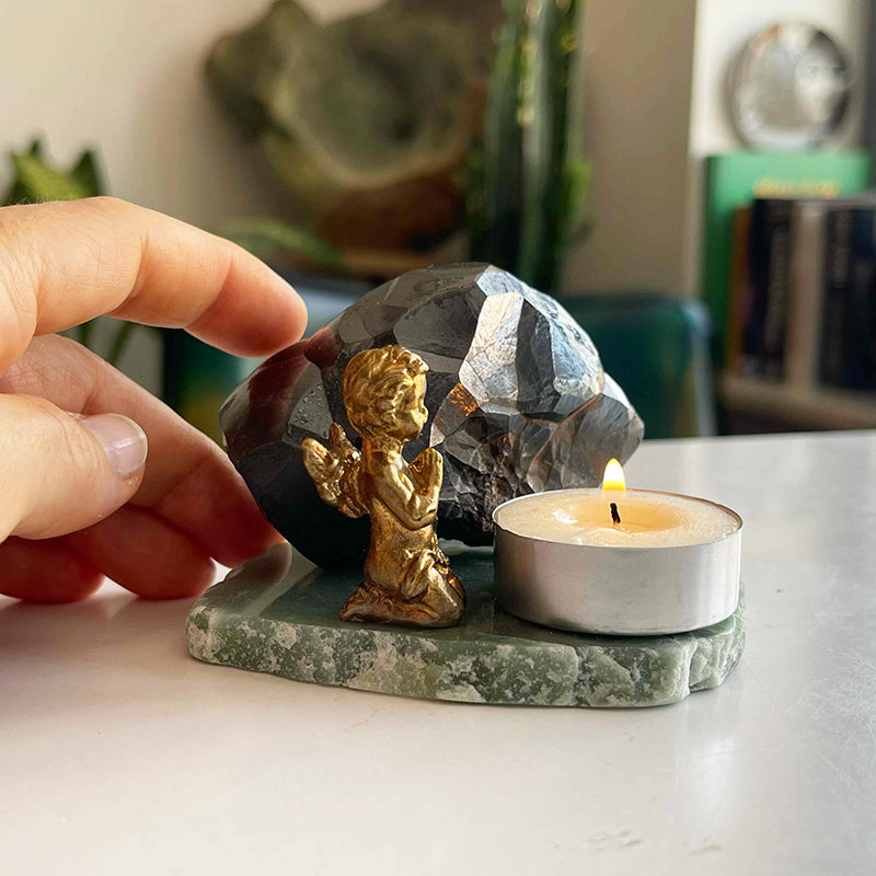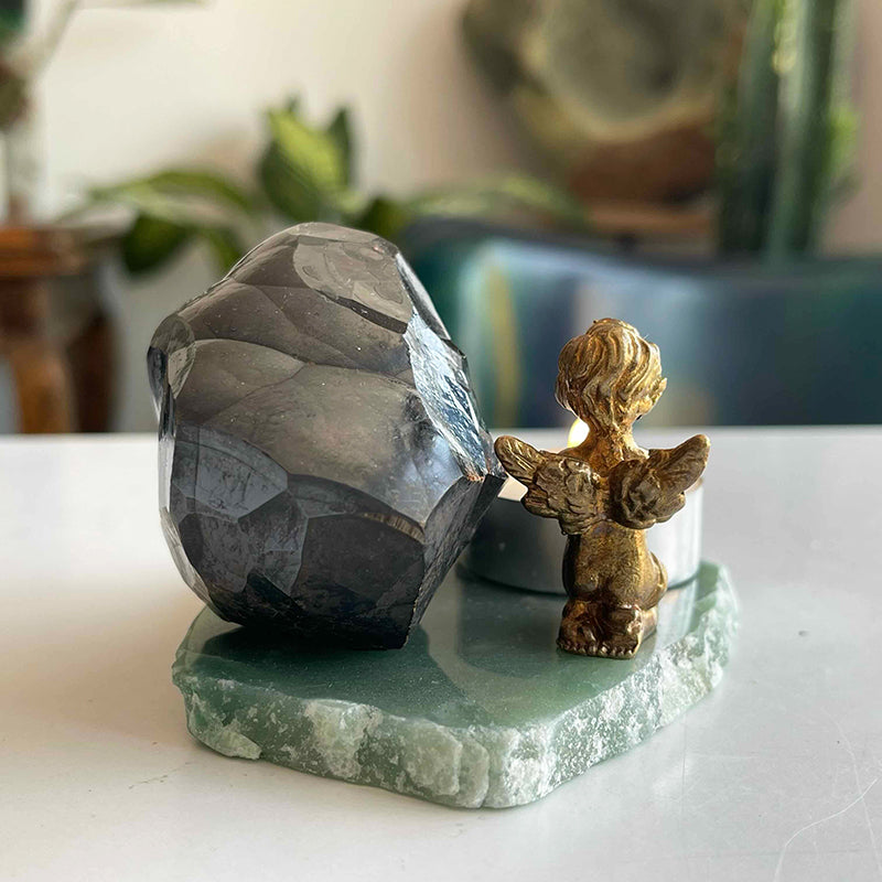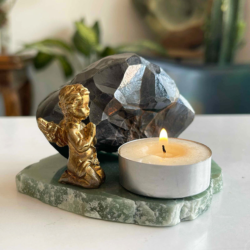 Aventurin tabaka, metalik renkli Hematit ve pirinç melek figüründen oluşan çalışma, duanın gücünü ve iyileştirici yönünü sembolize ediyor.