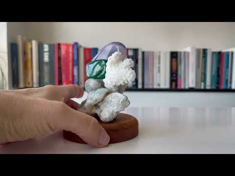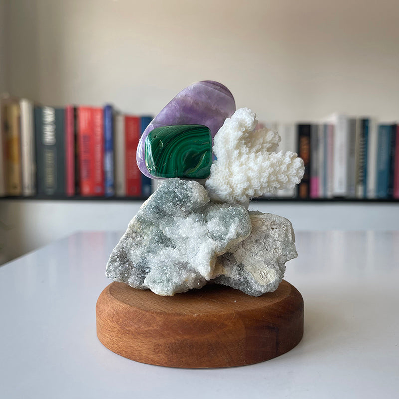 Bu Apofilit, Malakit, Ametist ve Mercan kristalleriyle tasarlanmış dekoratif heykel, evinizin veya ofisinizin atmosferine zarafet ve yüksek bir enerji katar.