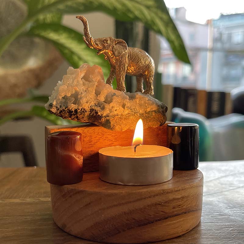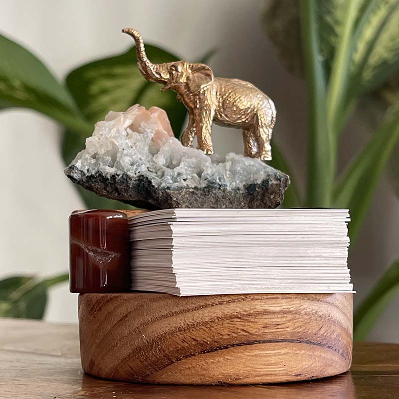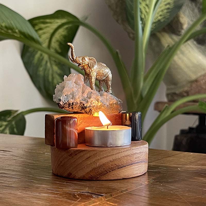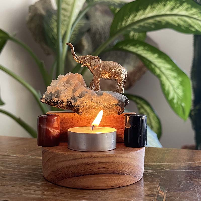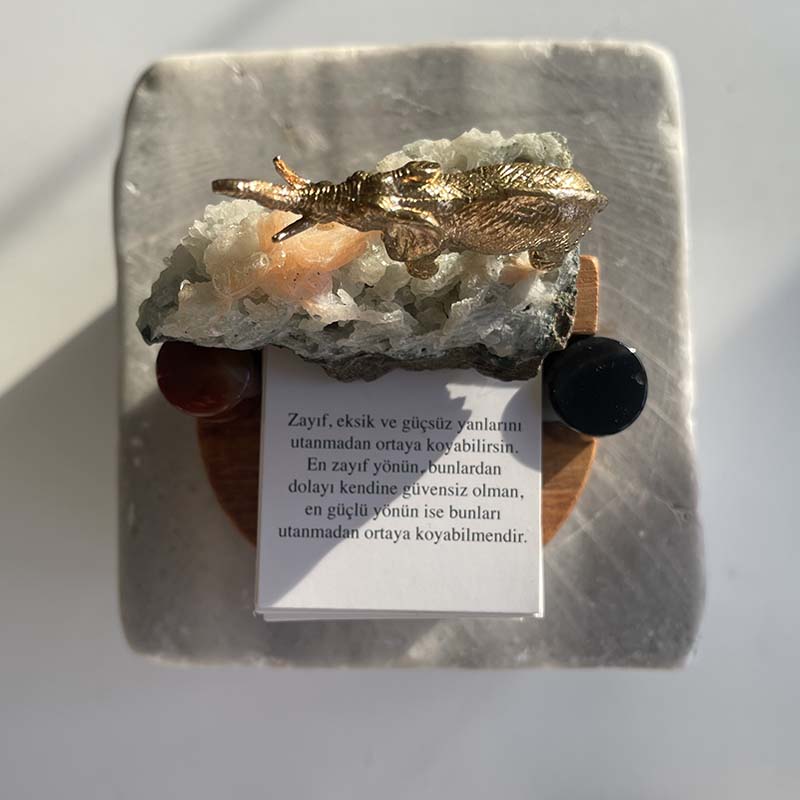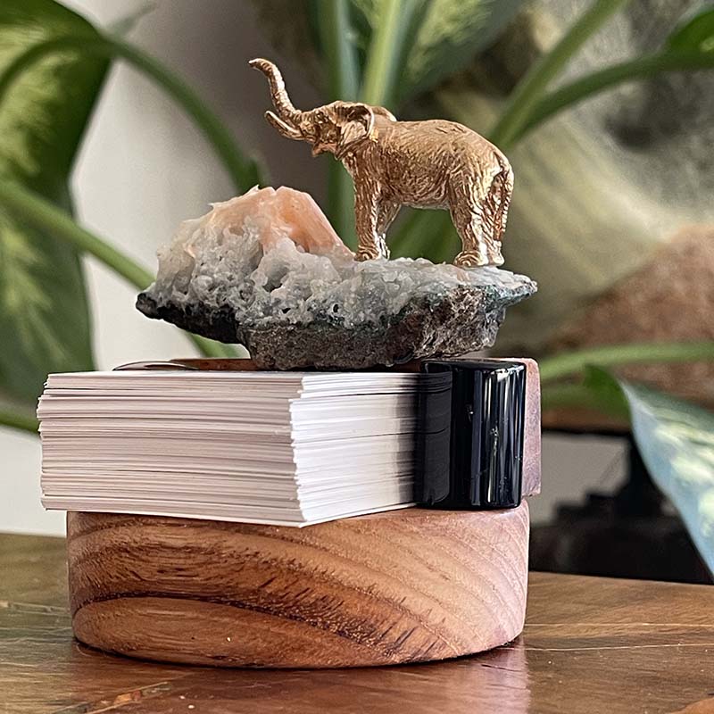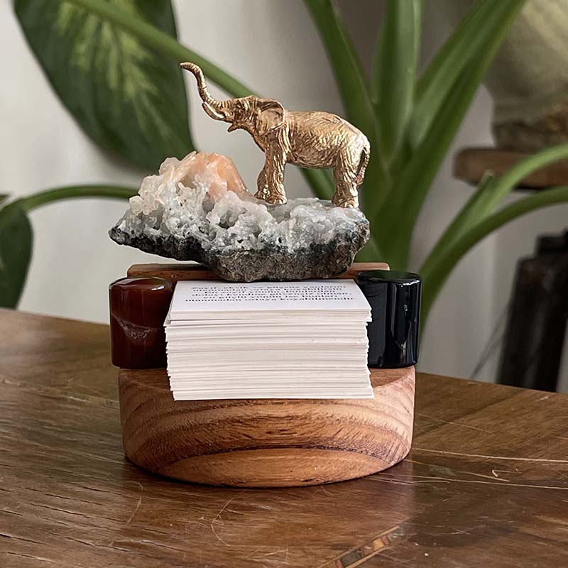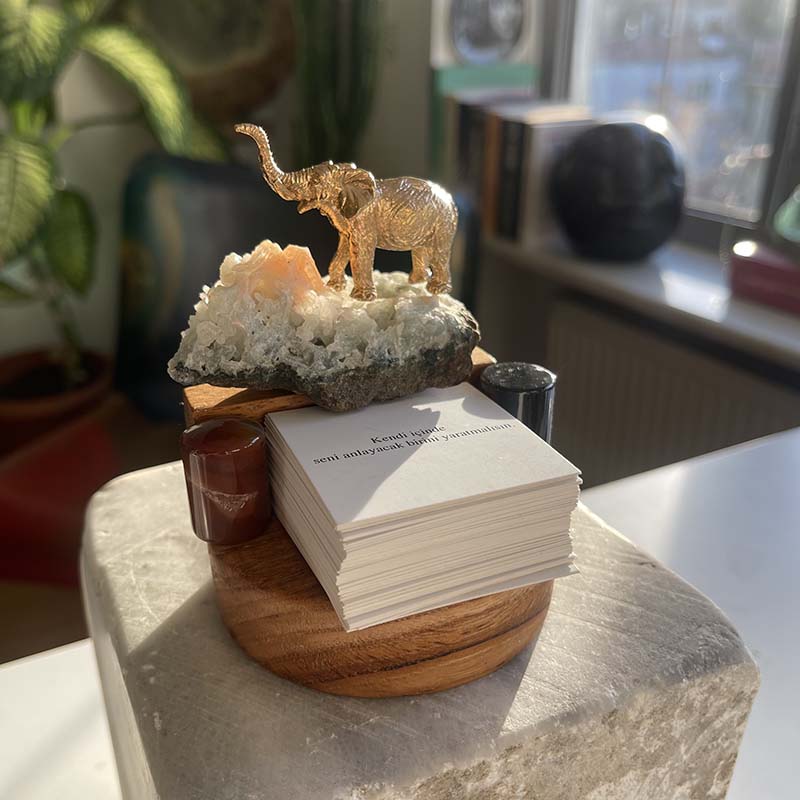 Bu özgün dekoratif çalışma; ahşap kaide üzerinde, Apofilit Kristali, Oniks, Karnelyan ve pirinç fil figüründen oluşur.