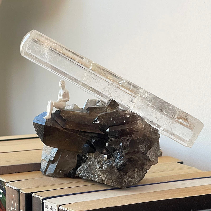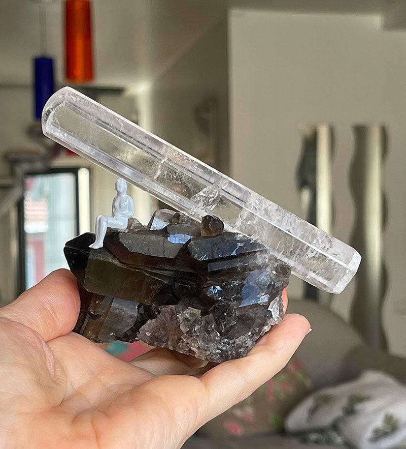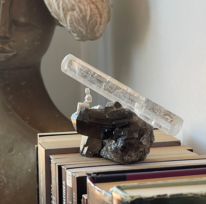 Tek parça ham Dumanlı Kuvars üzerine yerleştirilmiş berrak bir Kristal Kuvars Yoni ve altında oturan bir kadın figürü.