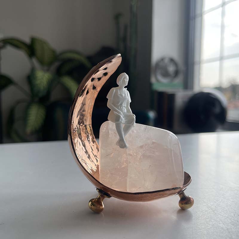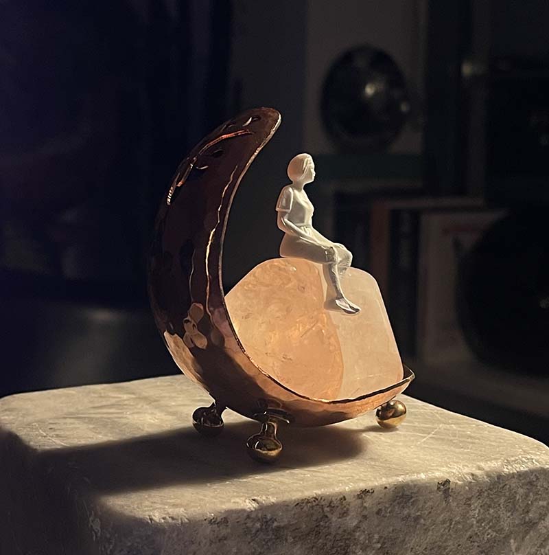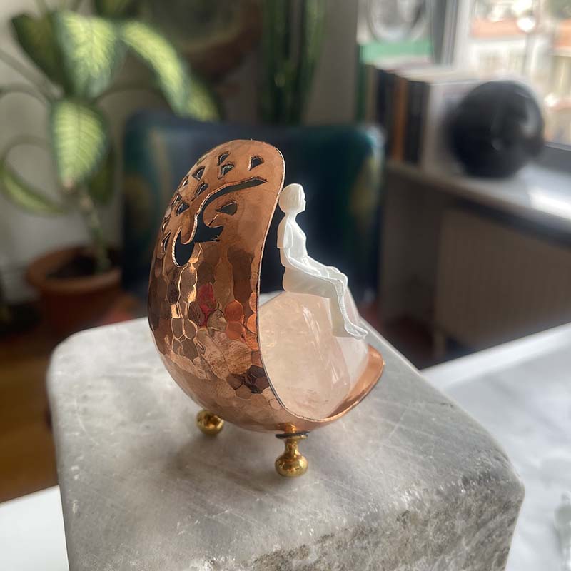Bakırın sıcak tonlarıyla hayat bulan bu özgün tasarım, Ay'ı andıran zarif hatlarıyla dikkat çekiyor. Tasarımın merkezinde yer alan Ay Taşı, yaratıcılık ve dişiliğin kutsal enerjisini yansıtan bir ilham kaynağı. Üzerinde oturan kadın figürü ise, sakin bir bilgelikle uzaklara bakarken, geçmişin izlerini geride bırakıp, geleceğe umutla adım atacak olan bir ruhu temsil ediyor.