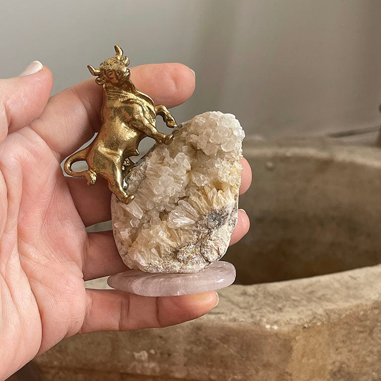 Pirinç boğa figürü ise kararlılığın, üretkenliğin ve irade gücünün simgesidir. Doğal ışıltısıyla güç, dayanıklılık ve maddi bereket enerjisini taşır. Yeryüzünün gücünü temsil eder. Pembe Kuvars'ın yumuşaklığıyla birleştiğinde, güçlü ama uyumlu bir denge oluşturur.