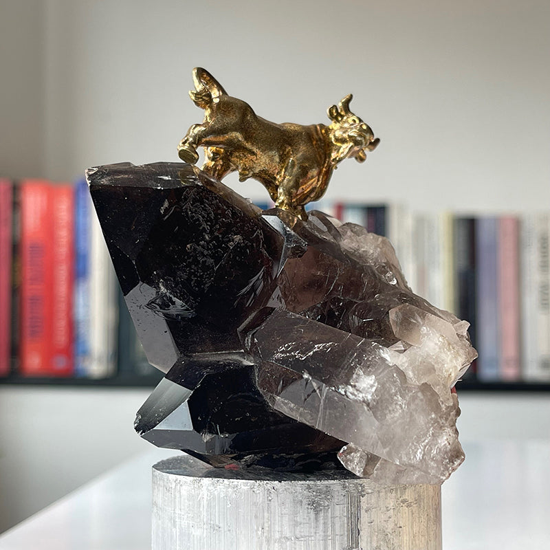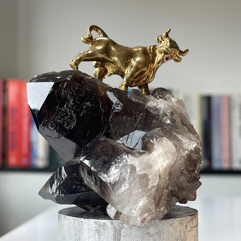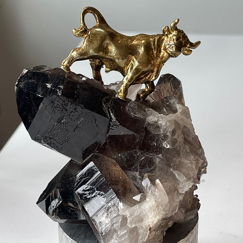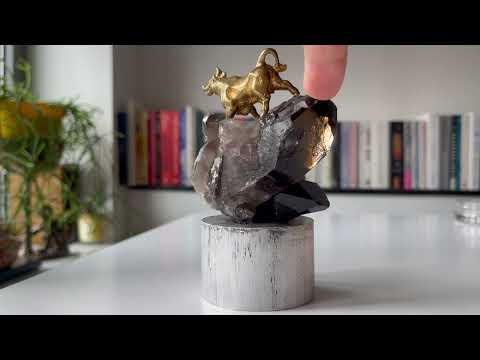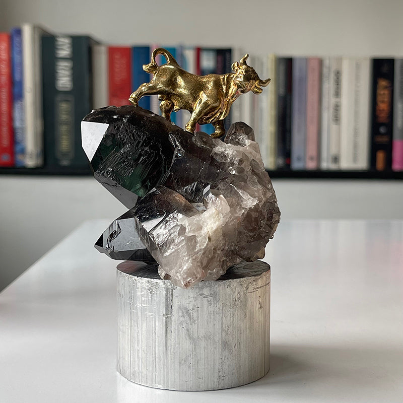 Aliminyum kaide üzerinde dağınık ve büyüleyici bir kütle halinde yükselen Dumanlı Kuvars, etkileyici bir dekorasyon parçası olarak ön plana çıkıyor. Enerji ve mistisizm sembolü olan Dumanlı Kuvars'ı, gücün ve kararlılığın sembolü olan pirinç Boğa figürü  tamamlıyor.