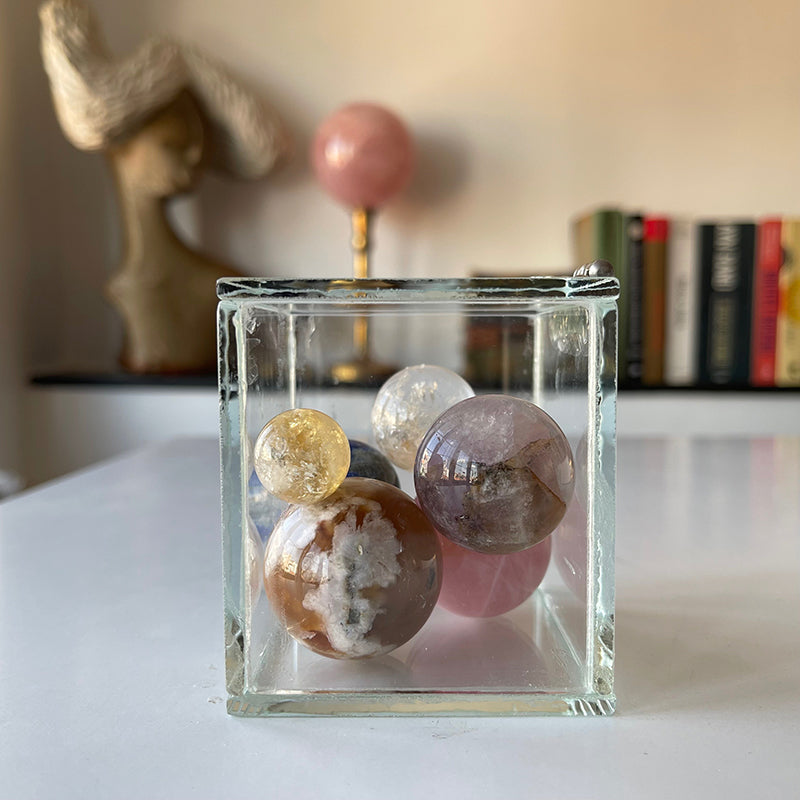 Cam kutunun içindeki kristal küreler, evinizdeki her alanı bir enerji noktasına dönüştürüyor. Her bir taşın kendine özgü rengi, şekli ve enerjisi, yaşam alanınıza doğanın renkli ruhunu getiriyor. Bu detay, sadece göze hitap etmekle kalmıyor, aynı zamanda evinizin enerji dengesini de zenginleştiriyor.