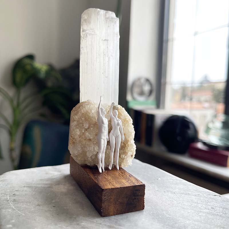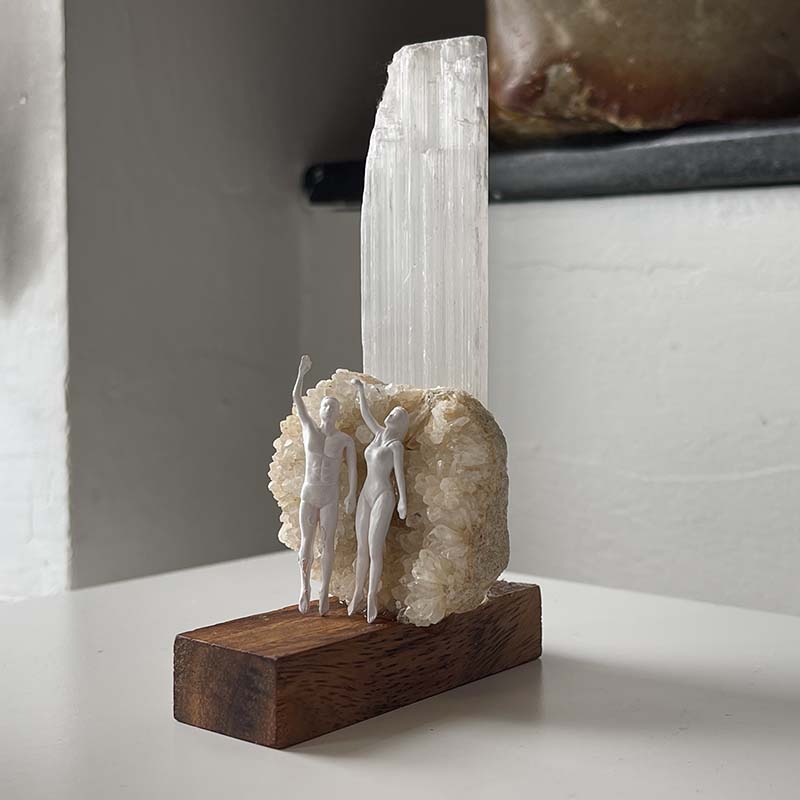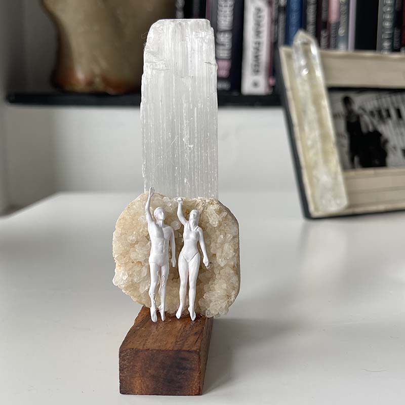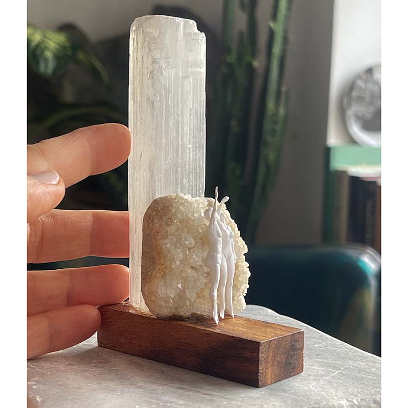 Çalışmada; ahşap blok üzerinde uzun bir parça Selenit Kristali ile buluta benzeyen bir Kristal Kuvars bulunur. Kristaller, tarih boyunca hem ruhani, hem de sembolik açıdan derin anlamlar taşımışlardır.