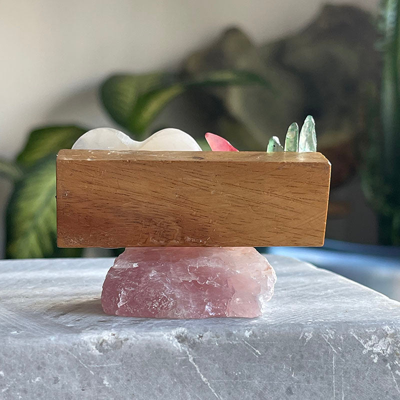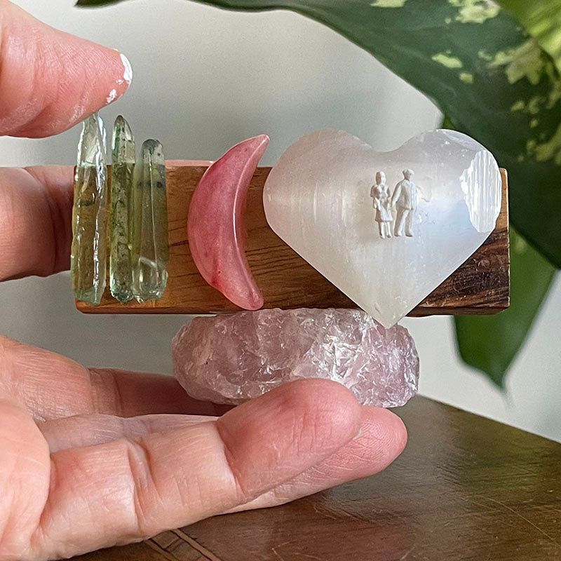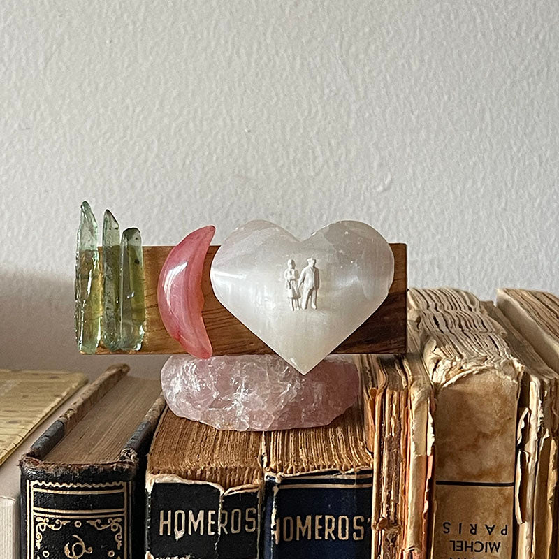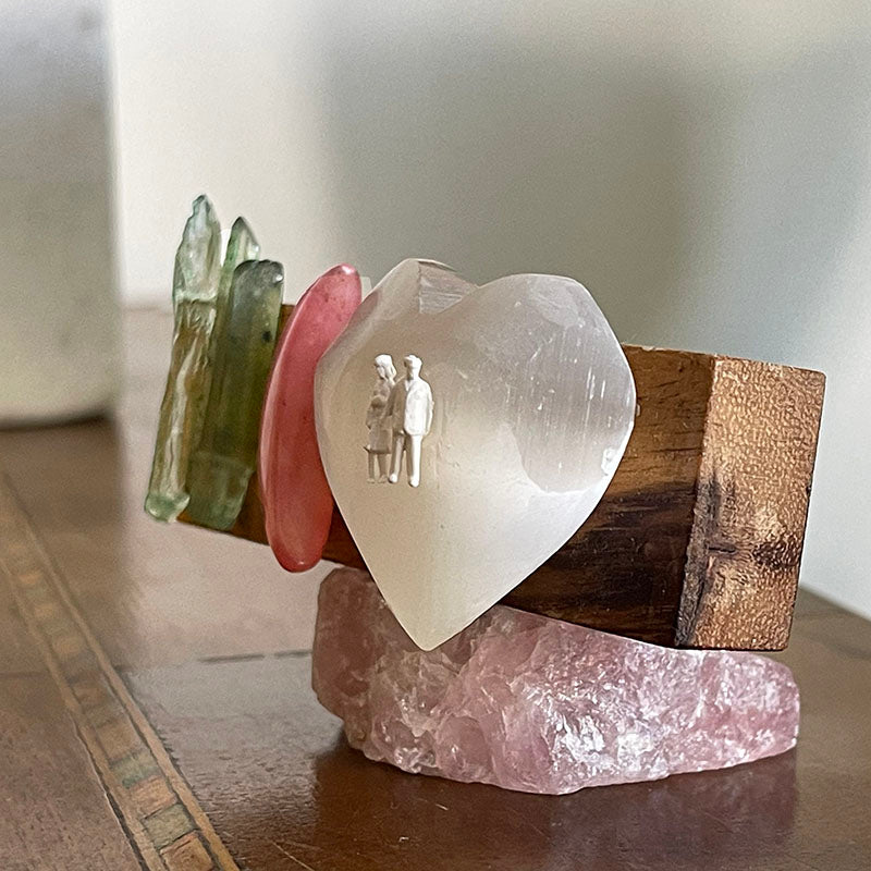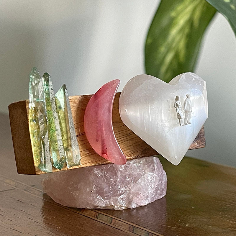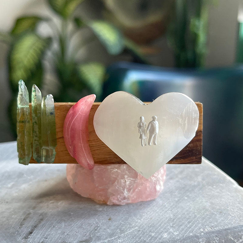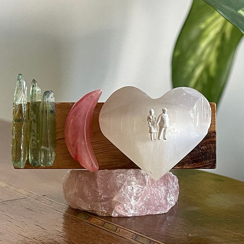 Bu zarif dekoratif çalışma, Pembe Kuvars kayası üzerine yerleştirilmiş ahşap bir blok ile başlıyor. Pembe Kuvars, sevgi ve duygusal iyileşme enerjisi yayarak sıcaklık ve şefkat hislerini güçlendirir. Bu bloğun üzerinde yer alan Selenit kalp, saflığı ve huzuru temsil ederken, kalbin üzerinde yer alan kadın ve erkek figürü, ilişkilerdeki dengeyi, sevgiyi ve bağlılığı simgeler. Selenit, negatif enerjiyi temizleyen ve denge sağlayan bir kristaldir, bu da çiftler arasındaki anlayışı ve empatiyi artırır.