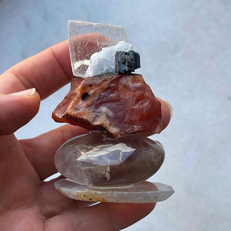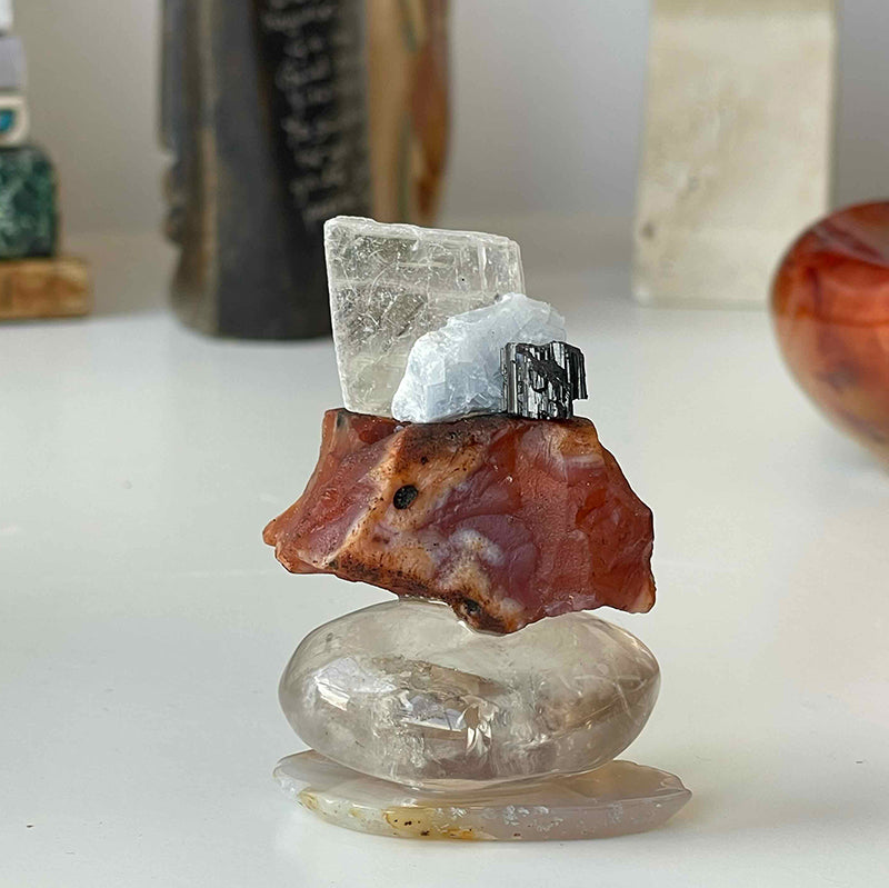 Akik, Kristal Kuvars, Karnelyan, sarı, mavi Kalsit ve Turmalin'den oluşan çalışma, enerjisel olarak pek çok ihtiyacınızı karşılamak üzere çeşitli kristalleri bir araya getiriyor.