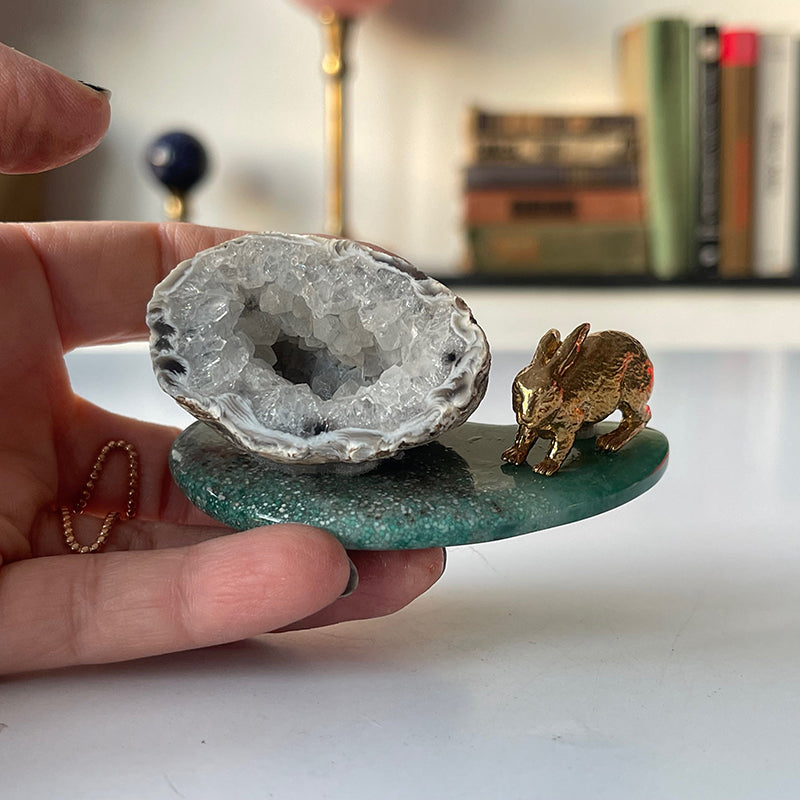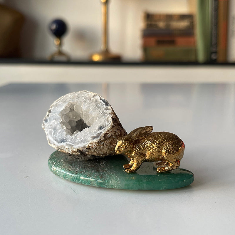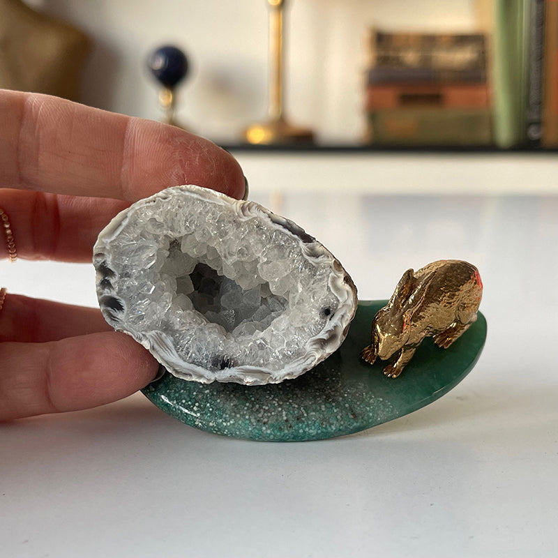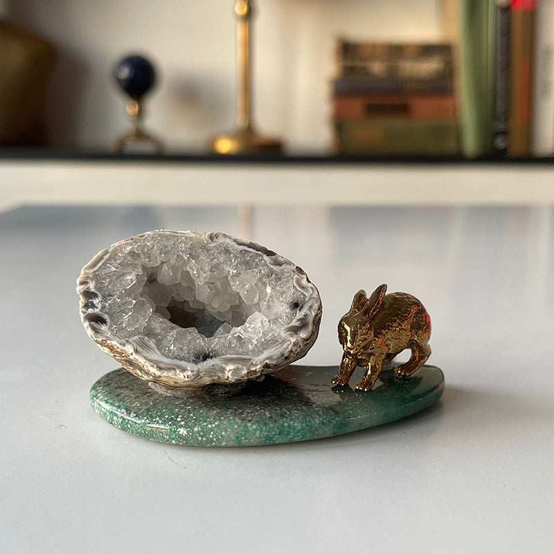 Yeşil Akik üzerinde Kalsit kristali ve yanında pirinç tavşan figürü, sembolik ve enerjetik açıdan zengin bir kombinasyon sunuyor. Bu güçlü üçlü, hem fiziksel hem de ruhsal anlamda size şans, bereket ve denge getirmeye yardımcı olur.