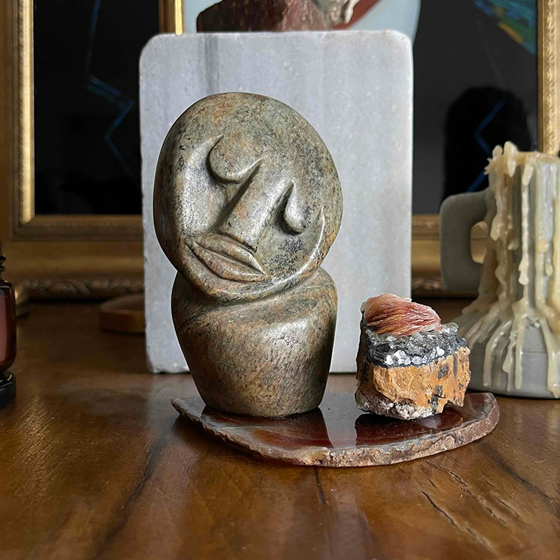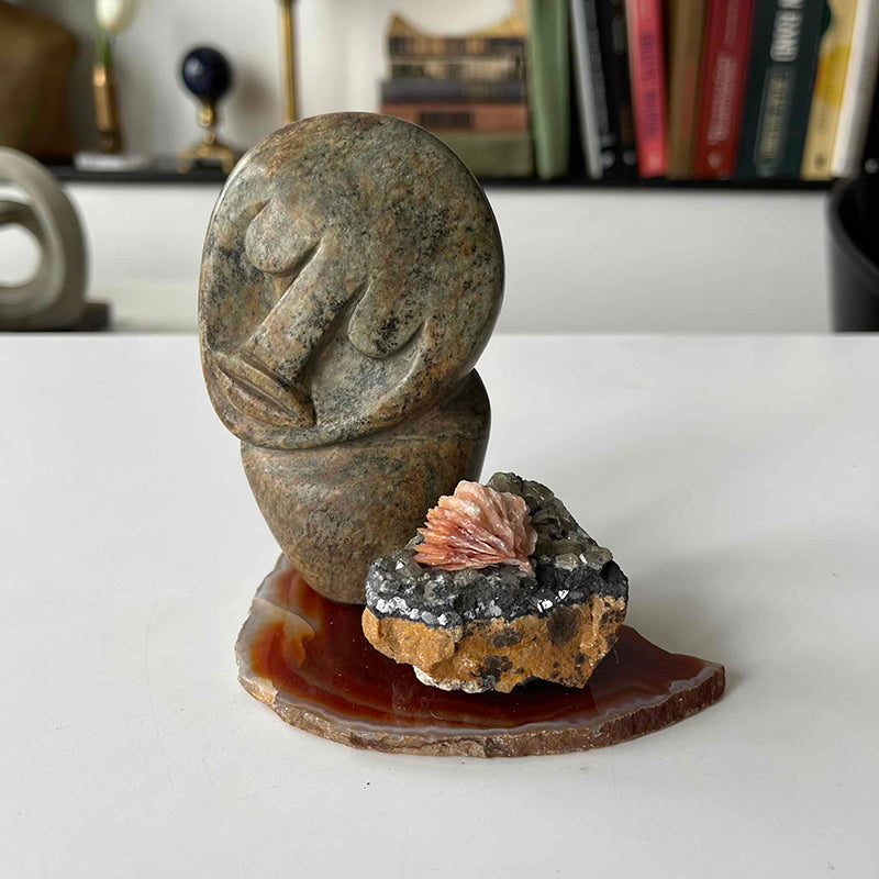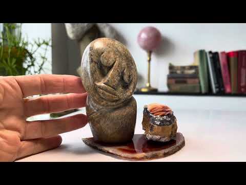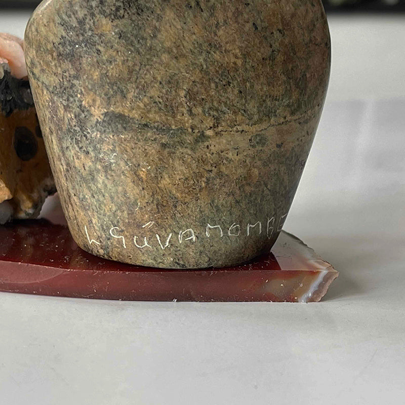Bu özel eser, bir akik taşı üzerine Serpentin taşından elde oyularak yapılmış bilge adam heykelciği, yanında yer alan lotus çiçeğini andıran Vanadinit taşı ile bir araya gelir.
