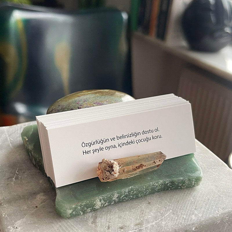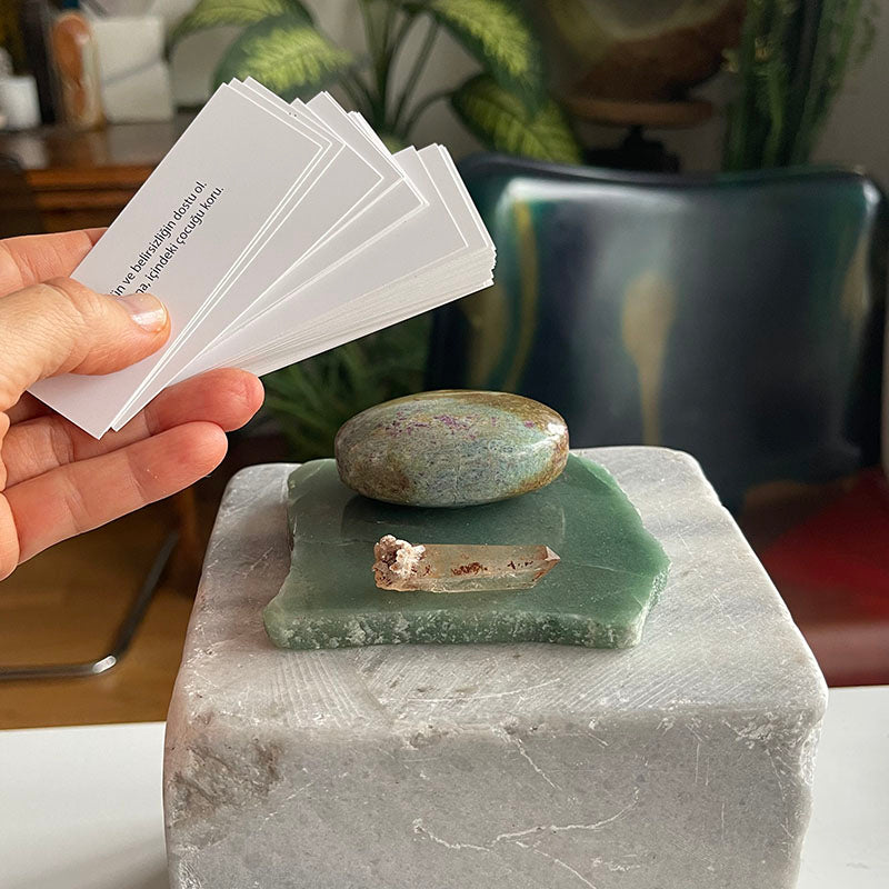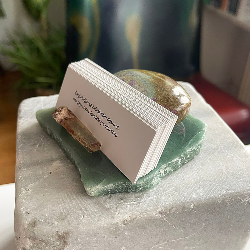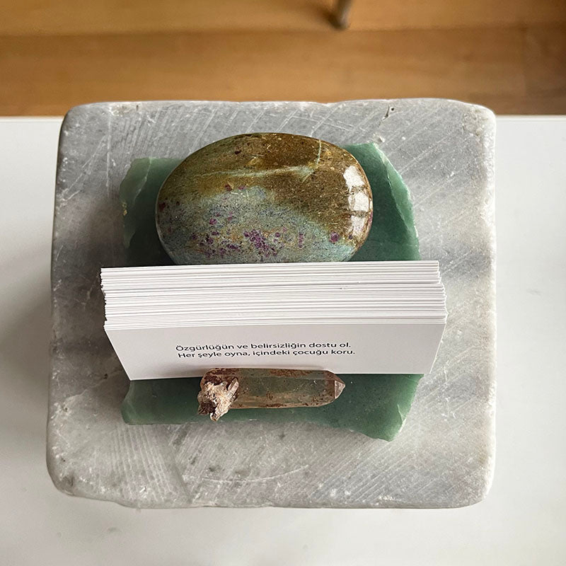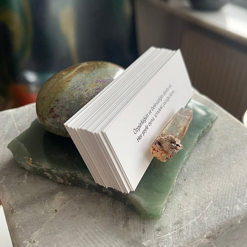 "İlham Taşı", günlük yaşama motivasyon ve ruhsal derinlik katan, kristallerin enerjisiyle harmanlanmış özel bir dekoratif çalışmadır. Aventurin tabaka üzerinde yer alan oval formdaki Ruby Fuksit ve çubuk şeklindeki Dumanlı Kuvars, hem görsel bir uyum hem de güçlü bir enerji dengesi sunar. Aralarında yer alan 30 adet kart ise, her güne ilham ve anlam katmak için tasarlanmıştır.