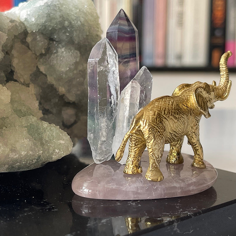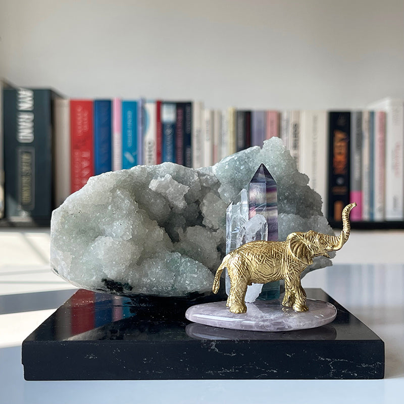 İyi Şans Totemi, doğanın zarafetini ve enerjisini evinize taşıyacak benzersiz bir tasarım. Büyük kütle halindeki Apofilit Kristali, kule formundaki Florit Kristali ve Kristal Kuvarslar ve Pembe Kuvars siyah taş kaidede ahenkli şekilde bir araya getirildi.