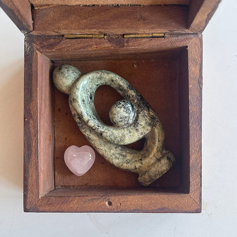 Yanında bir Pembe Kuvars kalp – sevginin, şefkatin ve koşulsuz bağın simgesi.