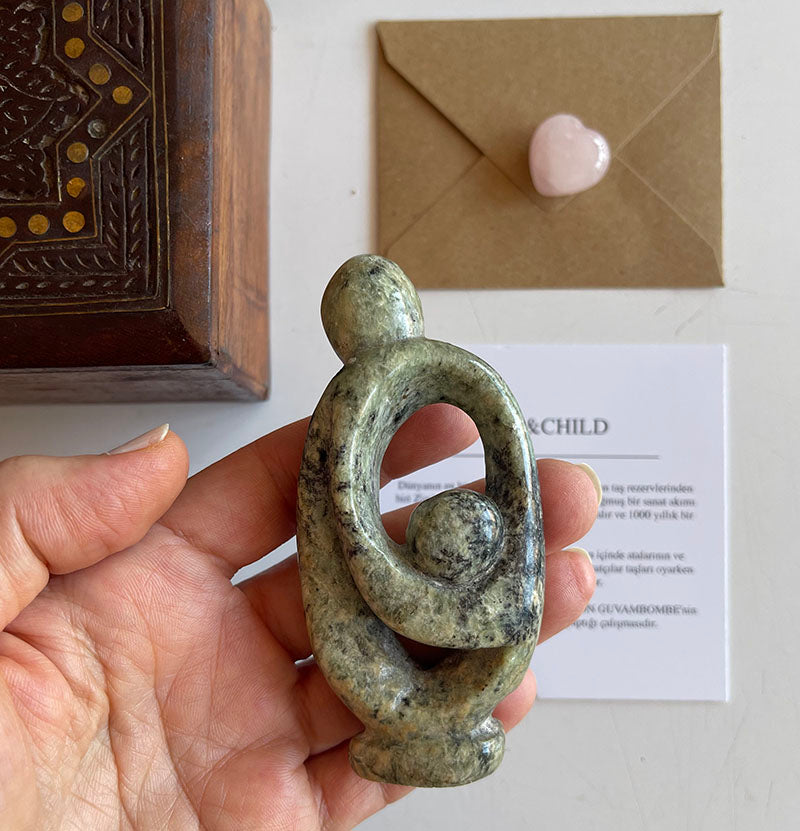 Taştan oyulmuş, bir sanatçının ellerinden çıkmış anne-çocuk heykeli…