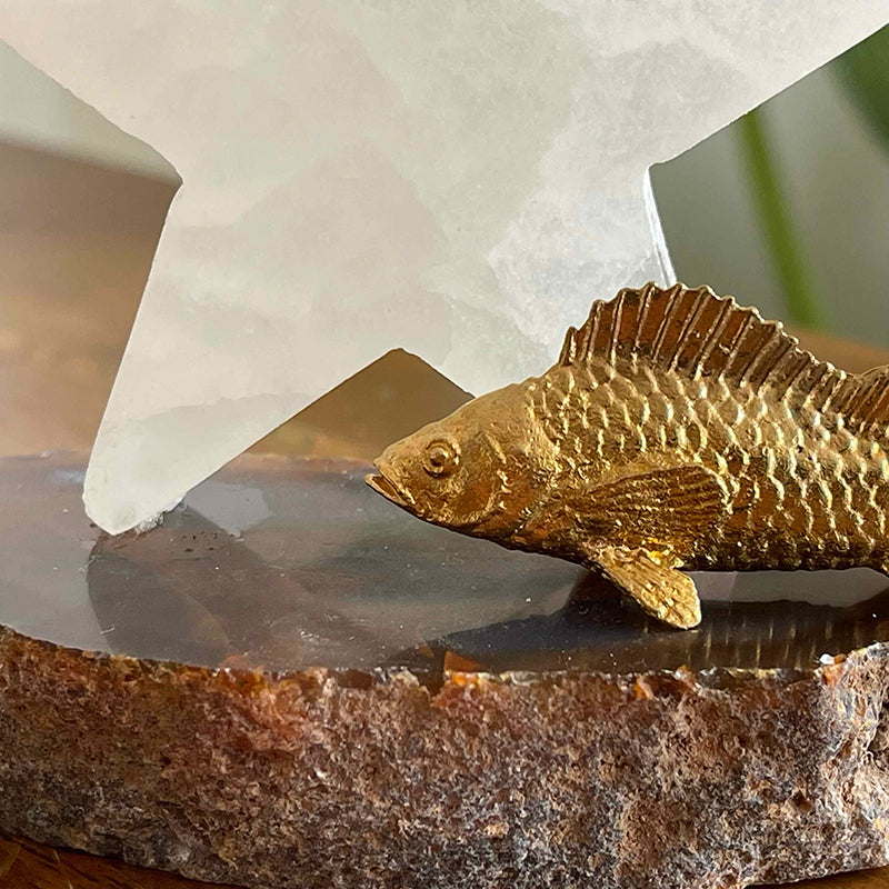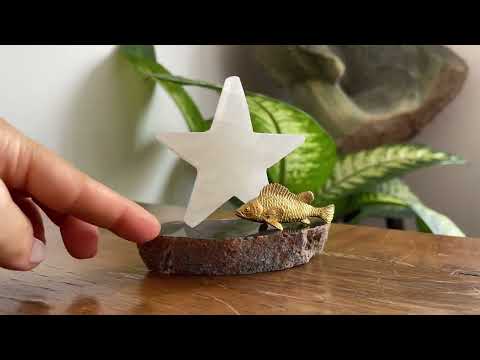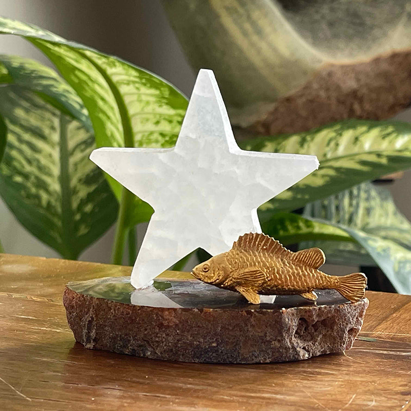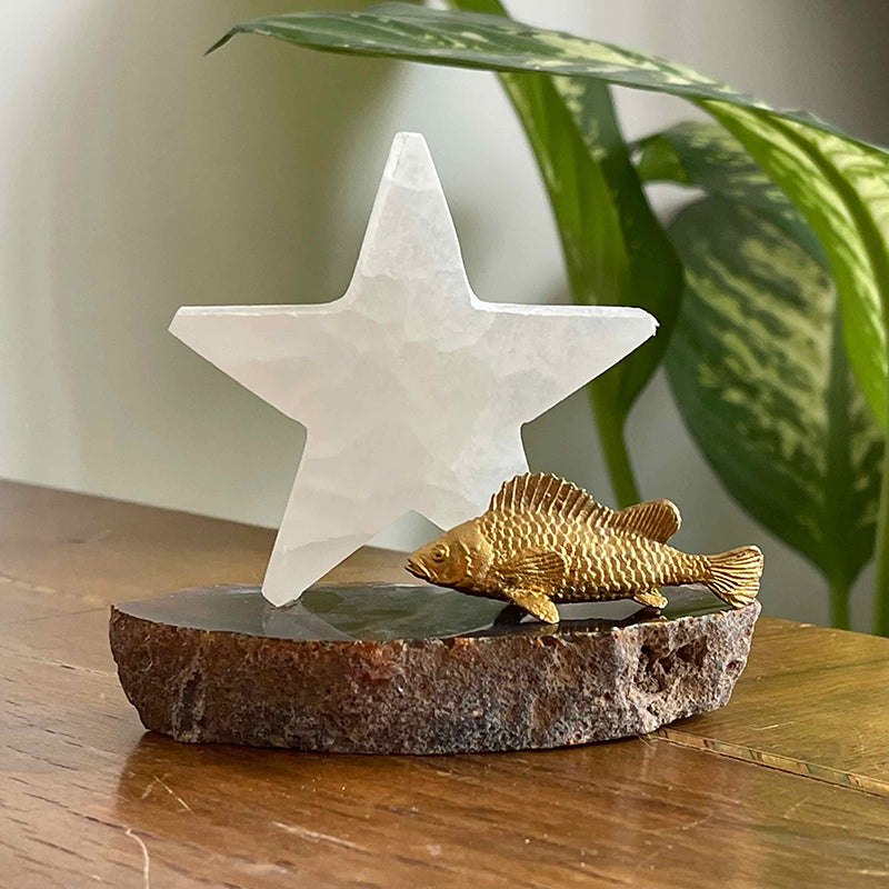 Akik kaide üzerinde yıldız formunda Selenit ve pirinç balık figüründen oluşan bu dekoratif çalışma, kısmetine kavuşan birinin yıldızının parlamasını sembolize ediyor.