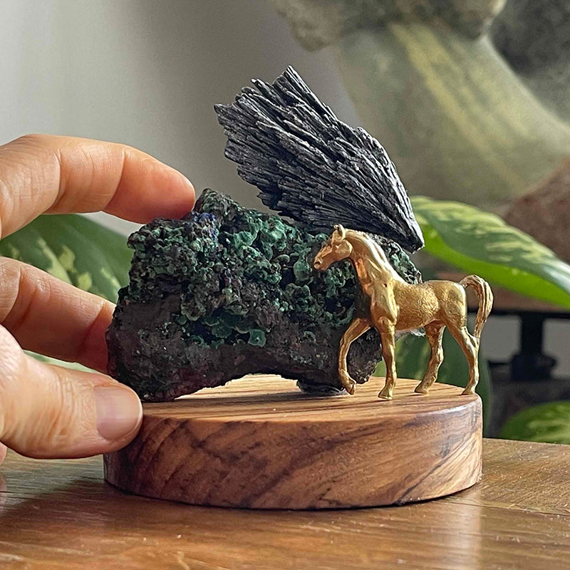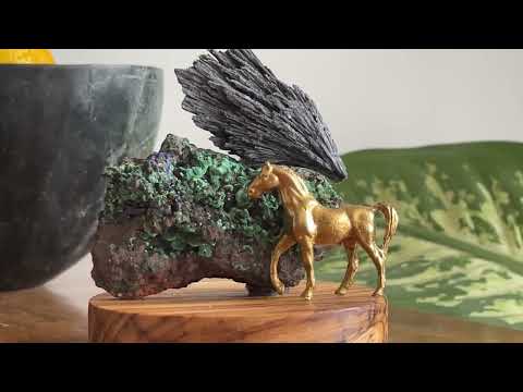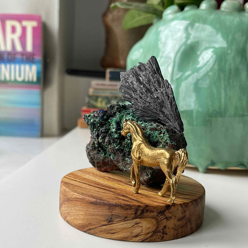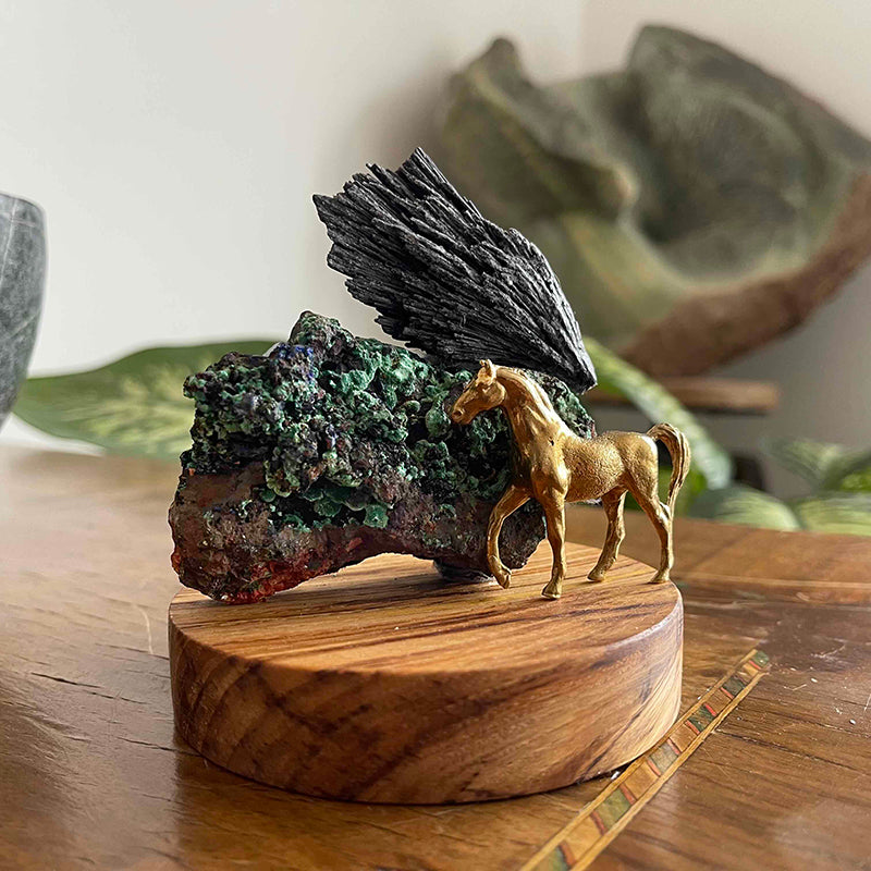 Ahşap kaide üzerinde Azurit ve Kyanit kristalleri ve pirinç at figürü. At tarih boyunca gücün, kuvvetin, asaletin, zaferin, dostluğun, özgürlüğün, sadakatin ve en çok da muradın simgesi olmuştur.
