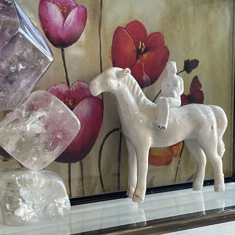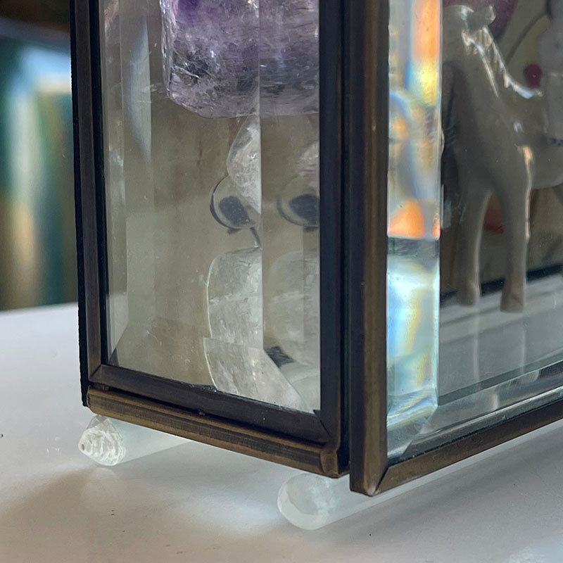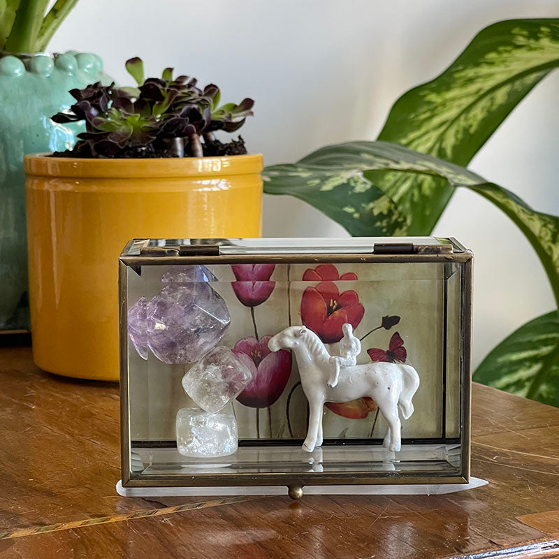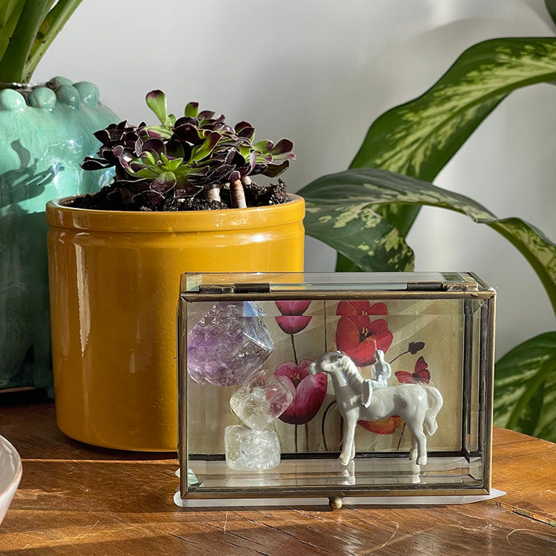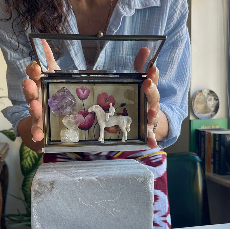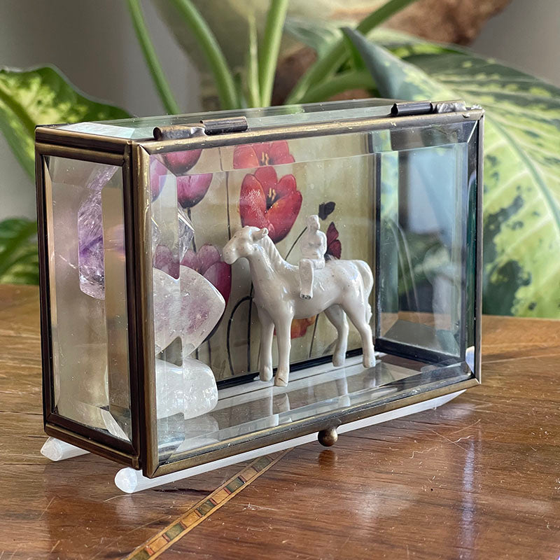 Bu nostaljik cam kutusu, yine üstü cam kaplı olan arka fonundaki çiçek bahçesini andıran deseniyle göz alıcı ve eğlenceli. Porselen at figürünün üzerinde Kendi Olmaya giden bir kadın figürü bulunuyor. Bu çalışma, hayallere ulaşma yolculuğundaki en büyük açılımların, insanın kendi olmasından geçtiğinin altını çiziyor. Fondaki çiçekler, kişinin kendi oldukça içinde açan çiçeklerin sembolü. Kadının önünde yer alan iki küp Kristal Kuvars ve Ametist, kadının varmak istediği hayallerini sembolize ediyor.