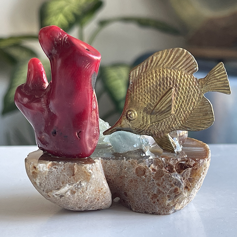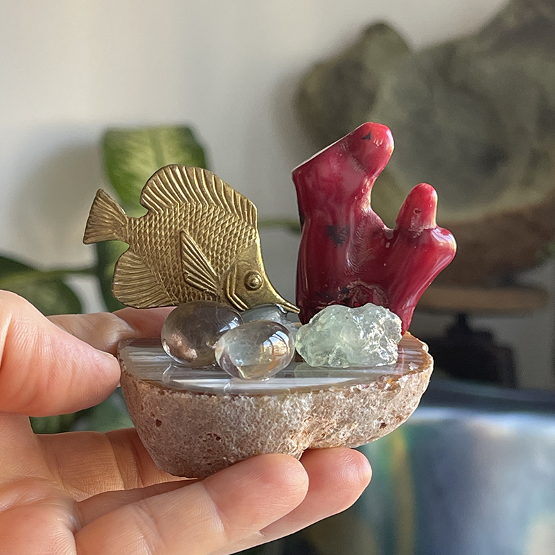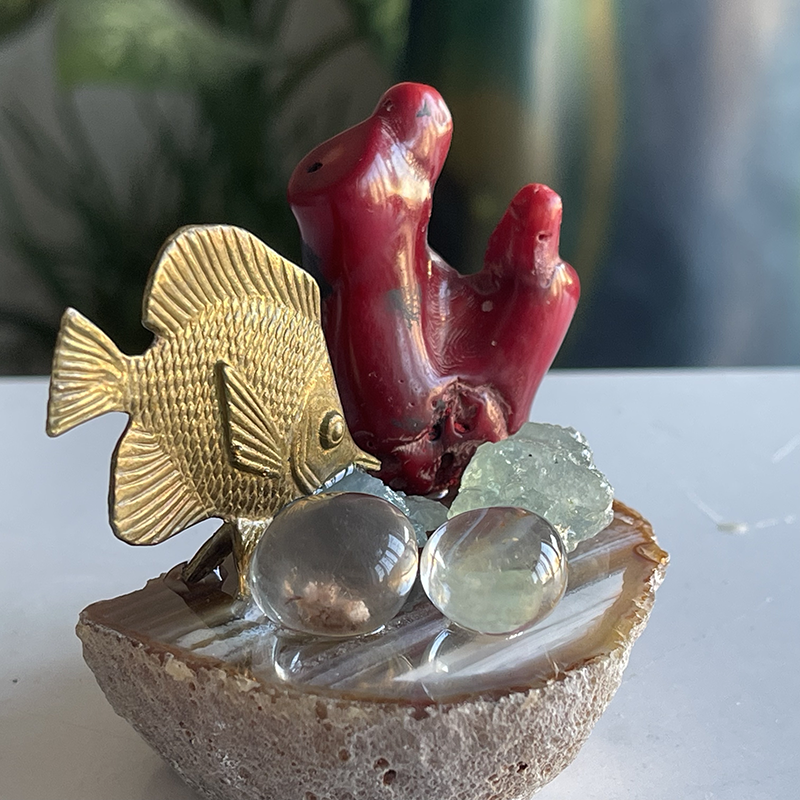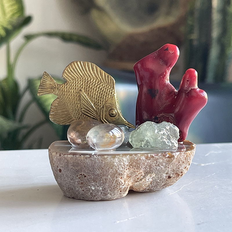 Kırmızı mercan, enerjiyi canlandırır ve tutkuyu simgeler, aynı zamanda denizlerin derinliklerindeki yaşam enerjisinin sembolüdür. Akuamarin, denizlerin berraklığını ve huzurunu çağrıştırır; sezgileri güçlendirir ve iletişimi kolaylaştırır. Kristal kuvars ise temizleyici ve şifa verici özellikleriyle bilinir, enerjiyi dengeleyerek pozitif bir atmosfer yaratır.