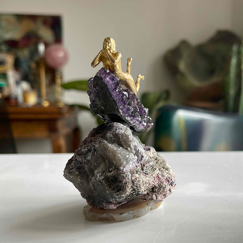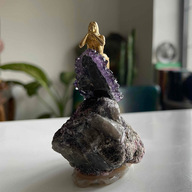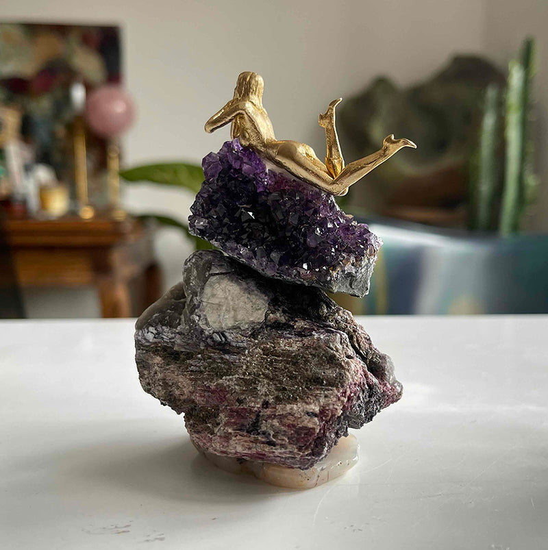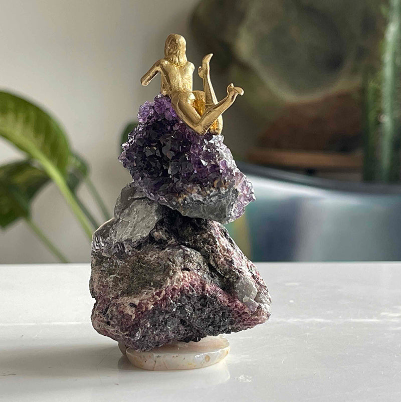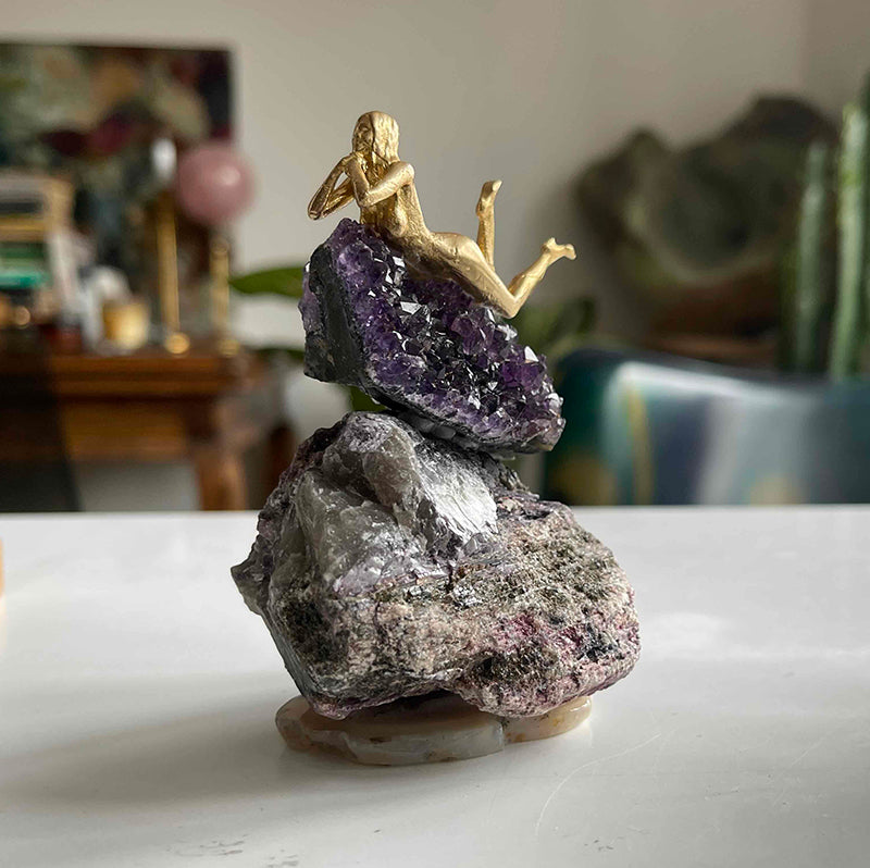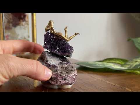 Akik kaide üzerinde yer alan Lepidolite taşı, üstünde göz alıcı bir Ametist ve pirinçten uzanmış bir kız figürü. Hayatı olduğu gibi kabul ederek deneyimlemenin rahatlığıyla yaşamanın hafifliğini sembolize ediyor....