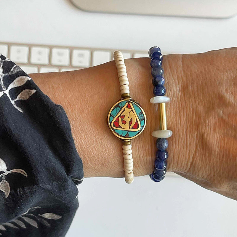 Krem rengi kemik dizisi, merkezde OM sembolü. Yanlarında ve bilekliğin birleşim yerinde metal görünümlü Hematitler. Kemik dizisi doğal ve organik bir görünüm sunar.