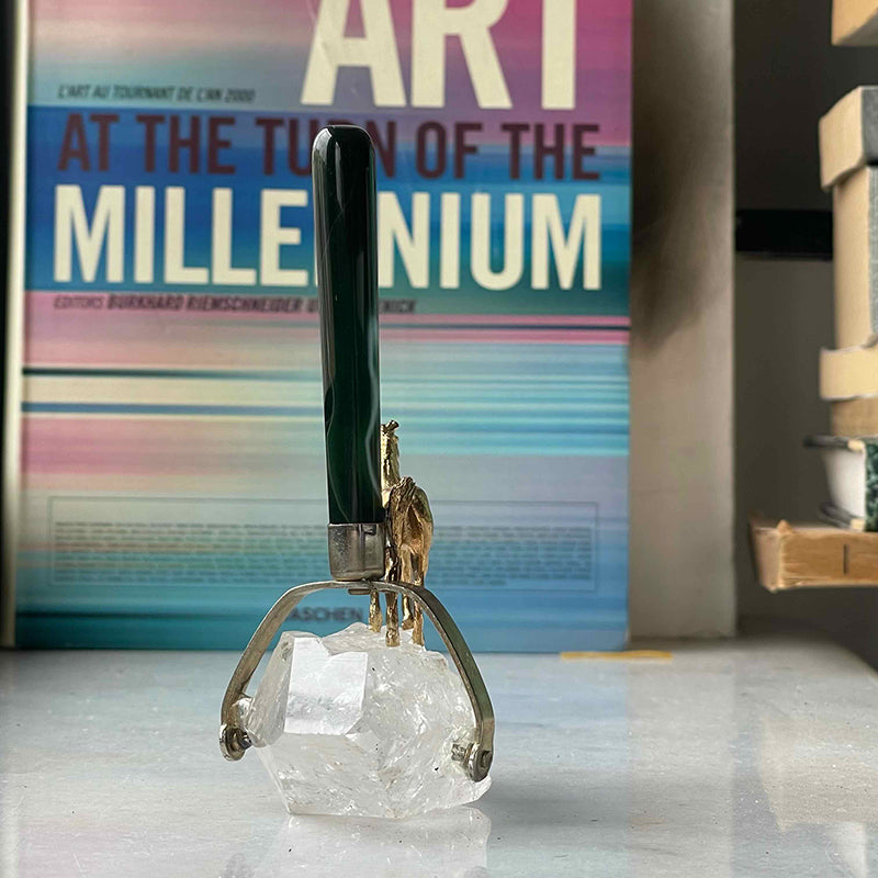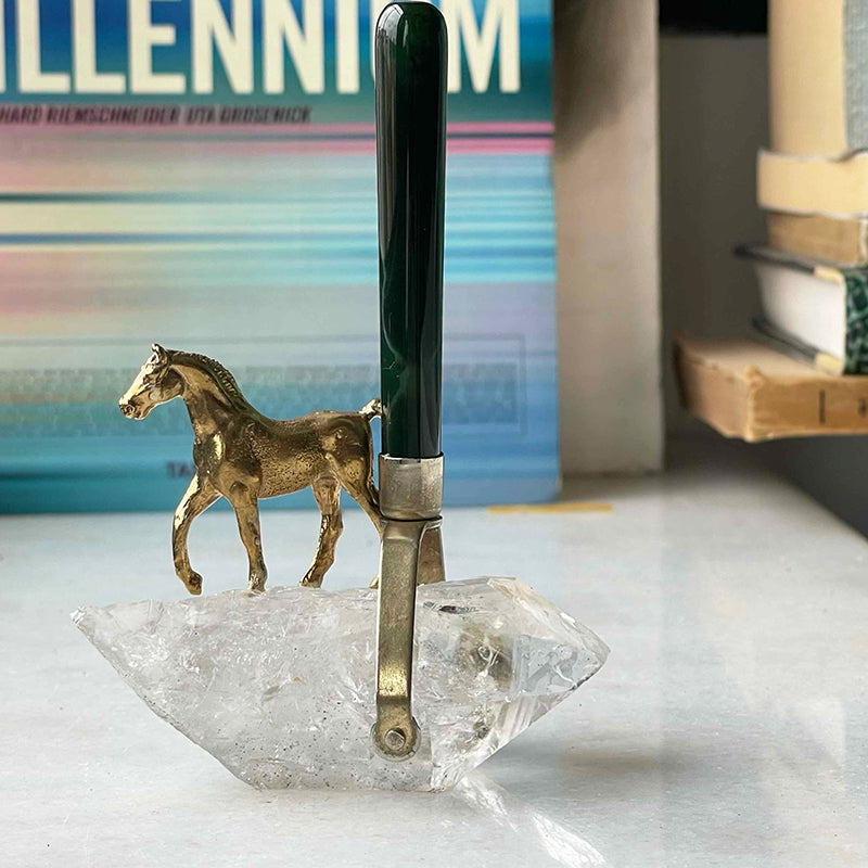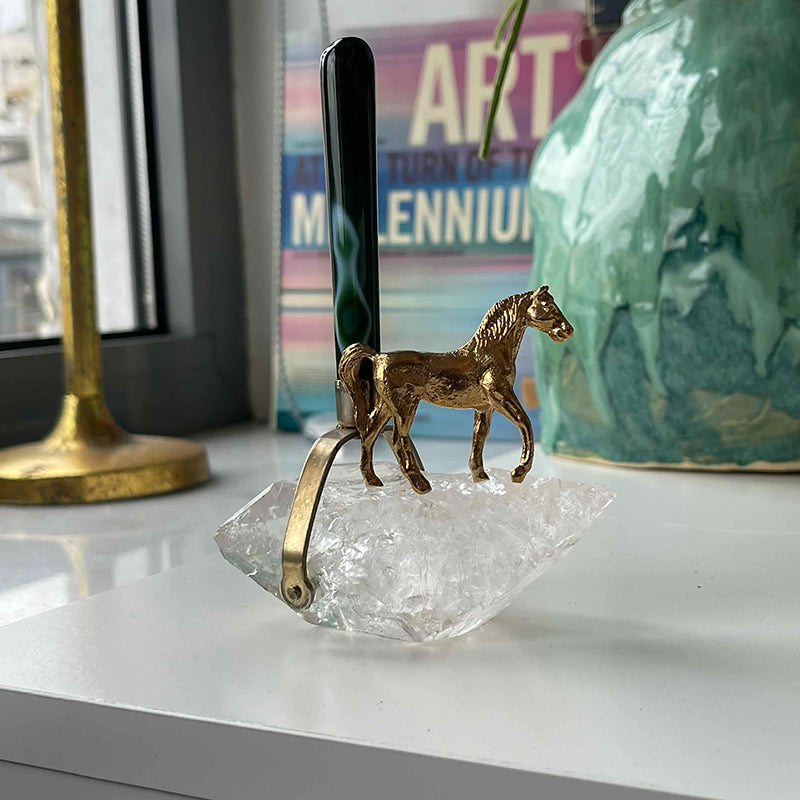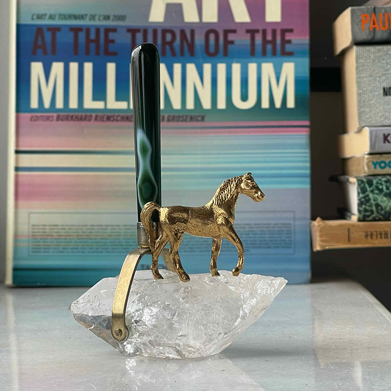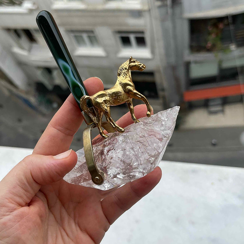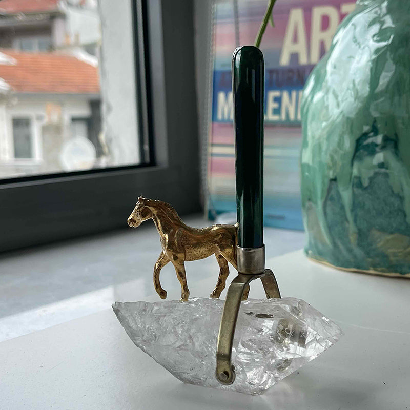 Bu dekoratif çalışma, berrak Kristal Kuvars kayası üzerinde zarif, pirinç bir at figürü ile başlar. Kristal Kuvars, enerjiyi yoğunlaştırma ve yayma yeteneğiyle bilinir, aynı zamanda berraklık ve içsel bilgelik getirir. At figürü ise özgürlüğü, gücü ve kararlılığı sembolize eder. Heykelin dikkat çekici diğer unsuru ise yeşil Akik ile tamamlanmış olan, mahmuzu andıran pirinç detaydır. Yeşil Akik, duygusal denge ve huzur sağlayarak ruhsal iyileşme ve koruma sunar.