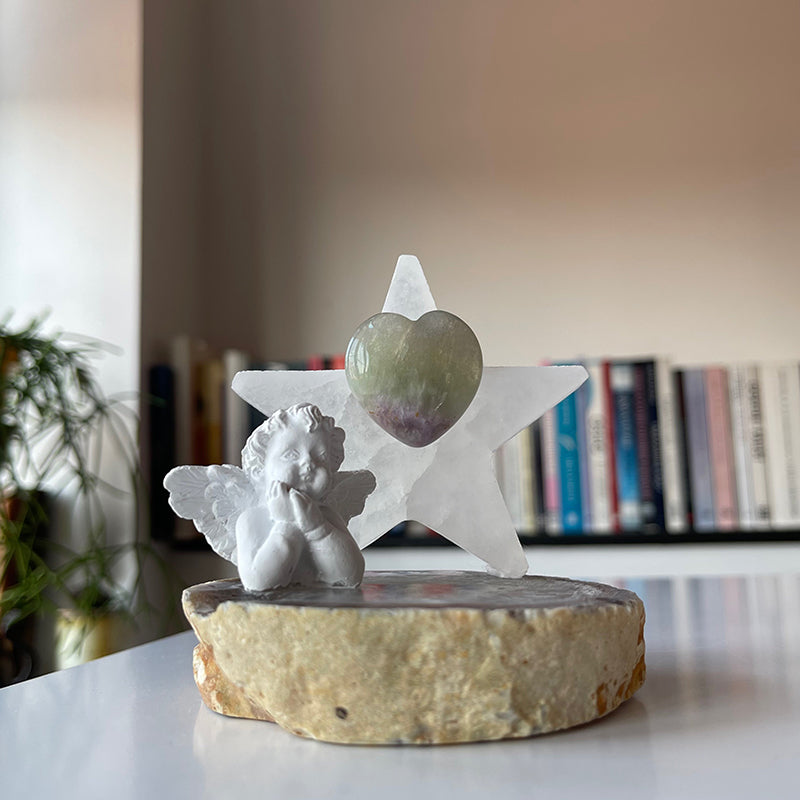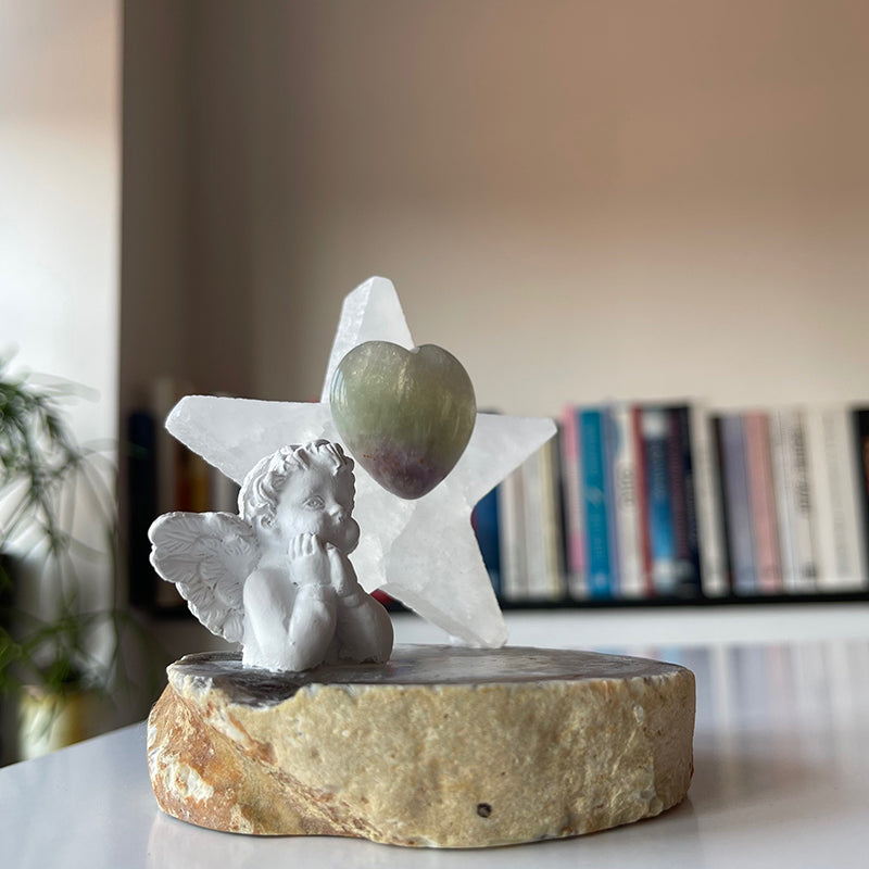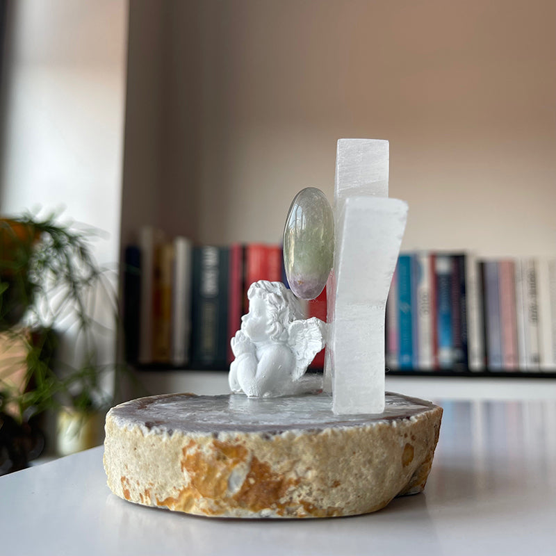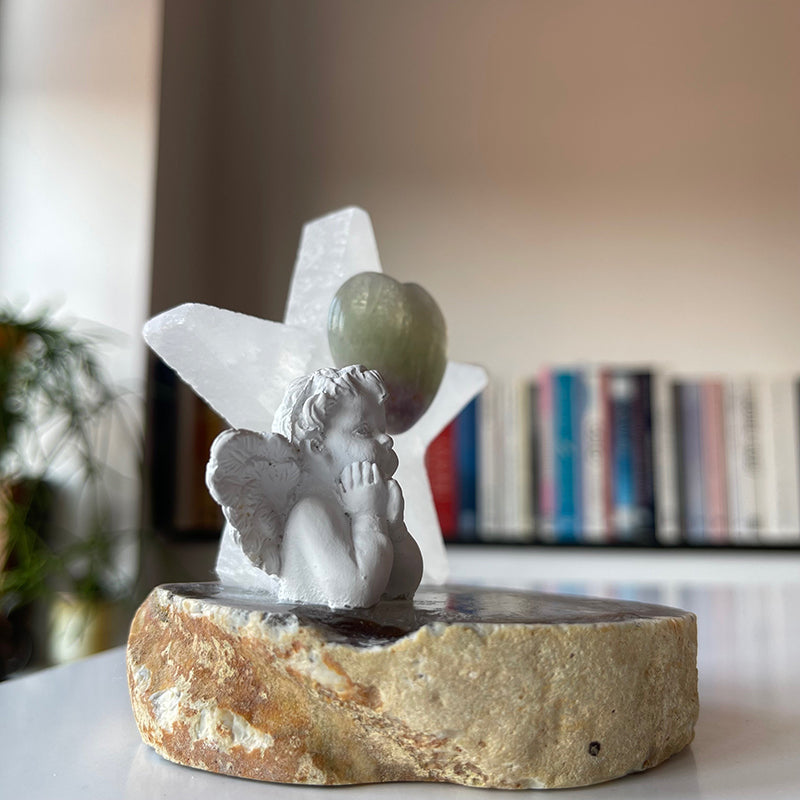 "Melek Aurası" Koleksiyonuna ait  her bir çalışma, melek figürleri ve doğal kristallerin zarif bir uyumunu temsil ediyor. Bu tasarımlar, evinizde sakinlik ve huzur yayan bir atmosfer yaratmanızı sağlayacak.