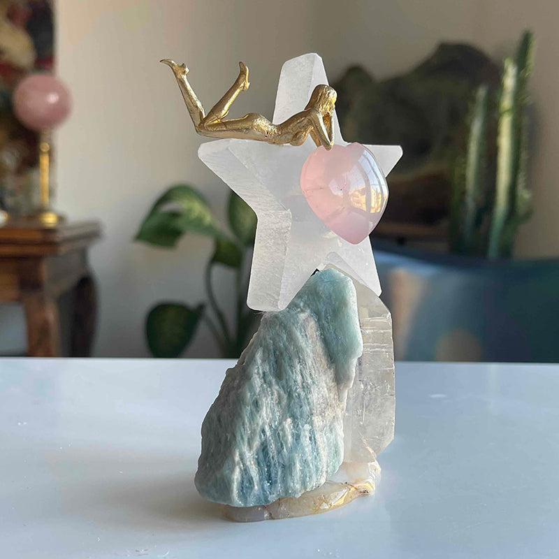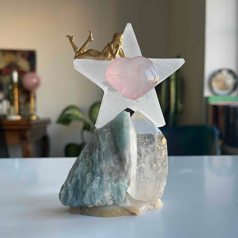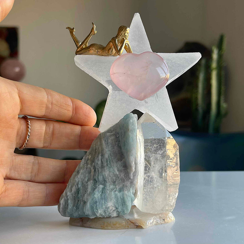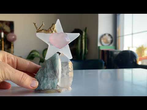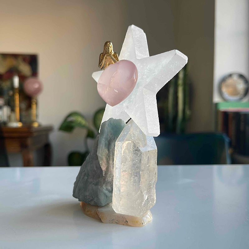 Akik kristali üzerinde yeşil tonlarında Akuamarin ve berrak Kristal Kuvars. Üzerlerinde Selenit yıldız ve yıldızın ortasında kalp formunda Pembe Kuvars.