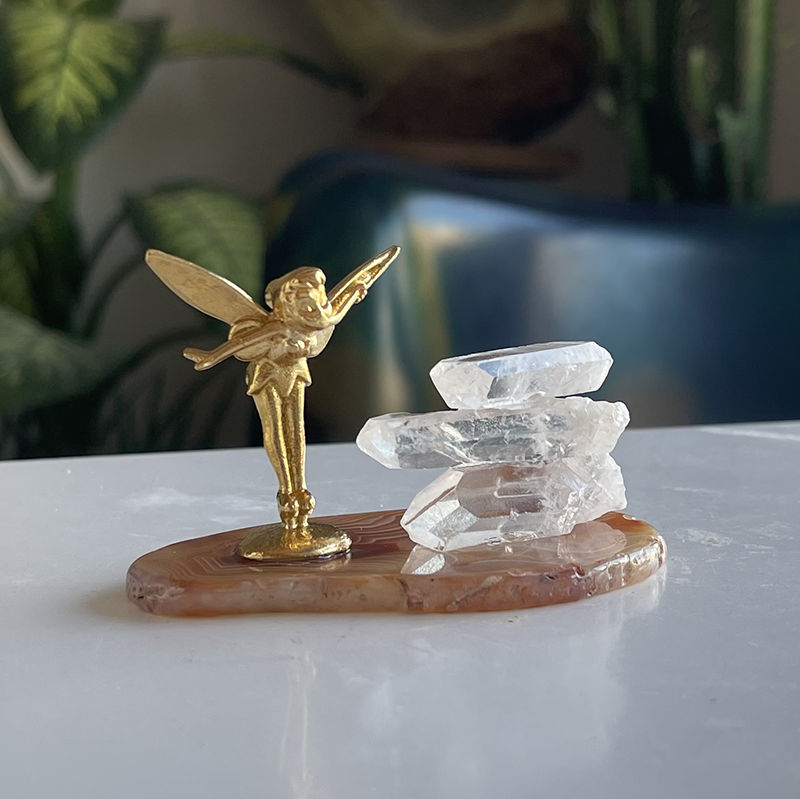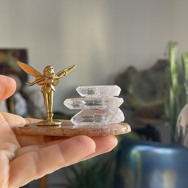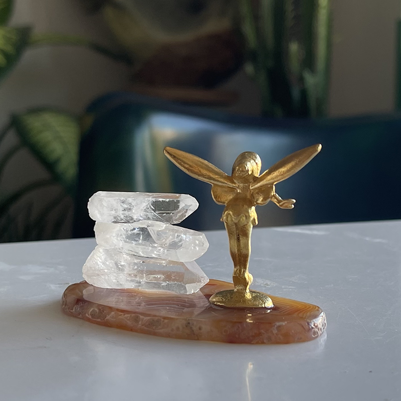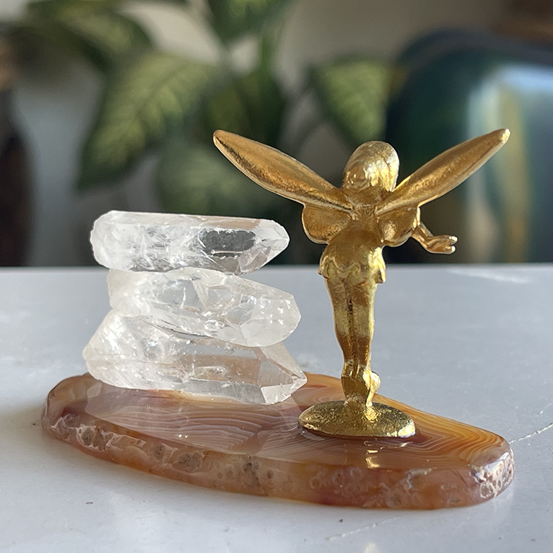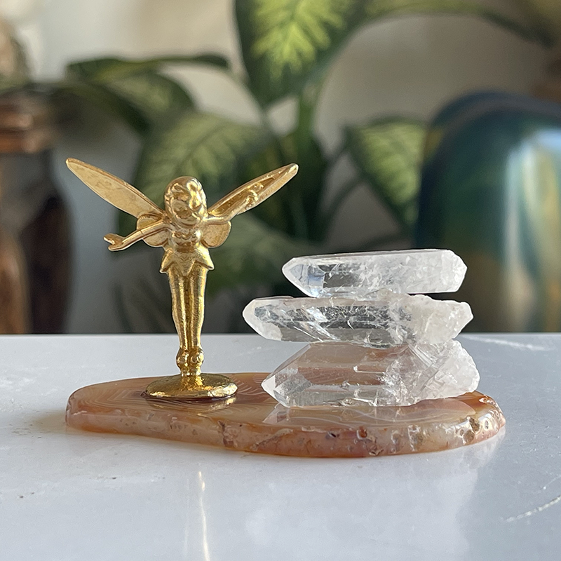 Akik kristalinin üzerine zarifçe yerleştirilmiş peri figürü ve Kristal kuvarslarla oluşan bu dekoratif heykel, yaşam alanlarınıza mistik bir dokunuş katıyor.