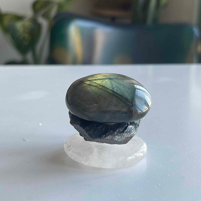 Daire formunda kristal Kuvars, Hematit ve ışıltılı Labradorit kombinasyonu...