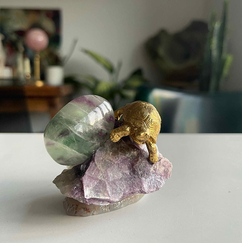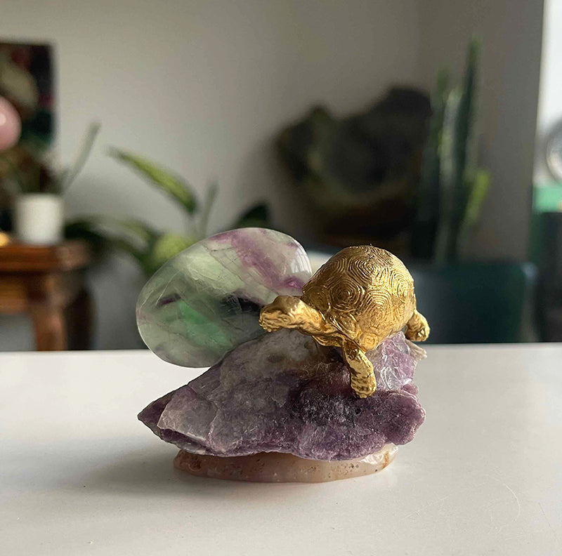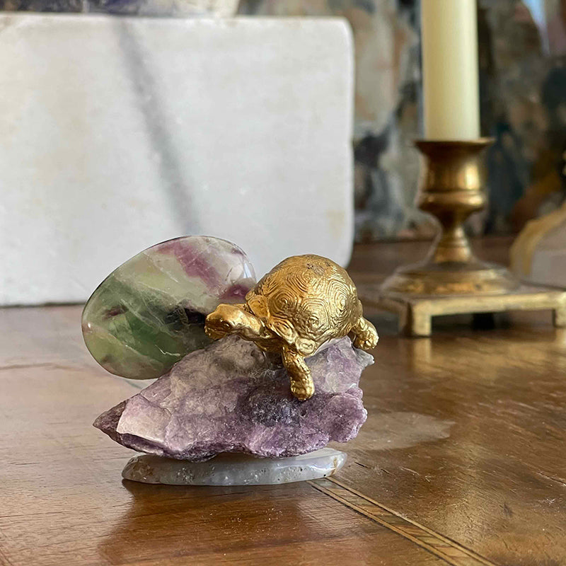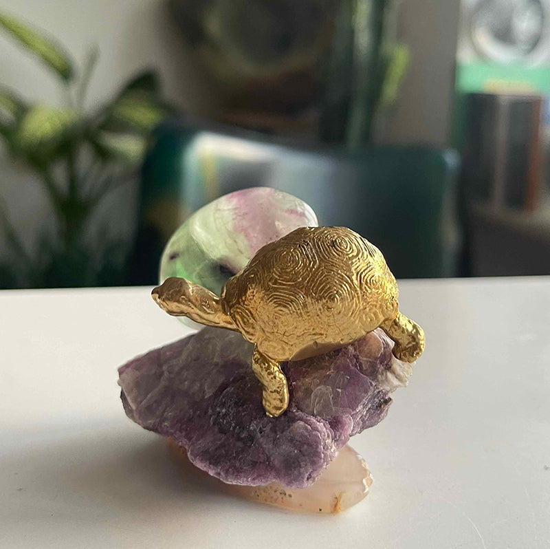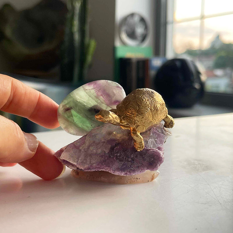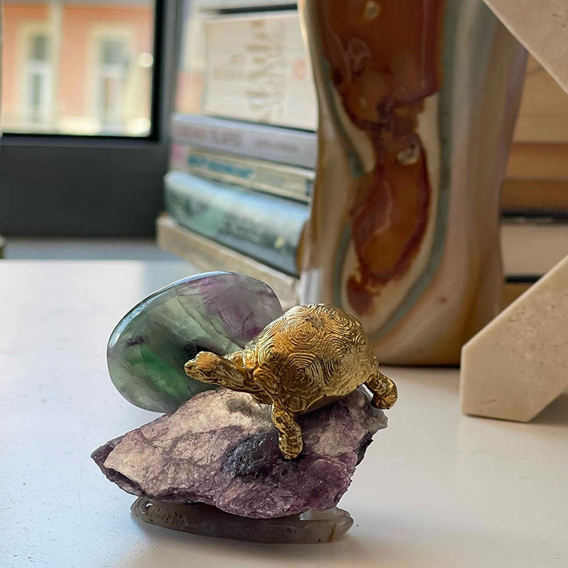 Sakinlik Abidesi, iç huzuru ve dengeyi sembolize eden benzersiz bir dekoratif parçadır. Lepidolite kristali, yeşil ve mor tonlarında ışık geçirgenliği olan Florit ve pirinç kaplumbağa figürü ile tasarlanmıştır. Dengede durması ve mobilyalarınıza zarar vermemesi için, pürüzsüz Akik bir kaide üzerinde yer alır.