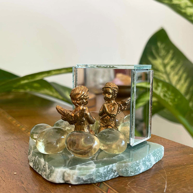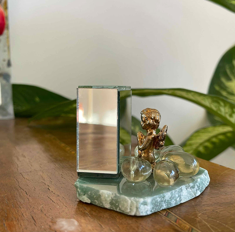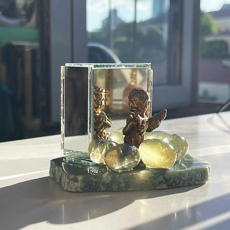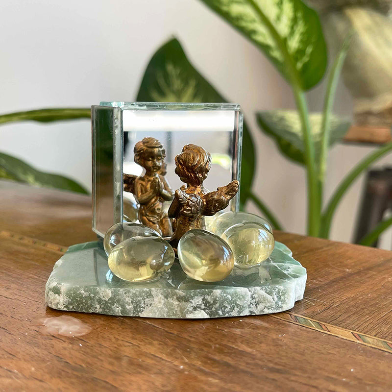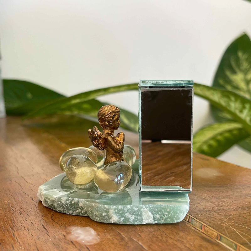 Aventurin tabaka üzerinde küp formunda ayna, önünde pirinç melek ve etrafında Limon kuvarslar.