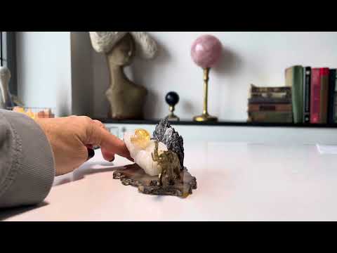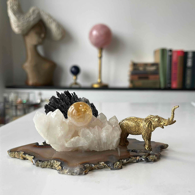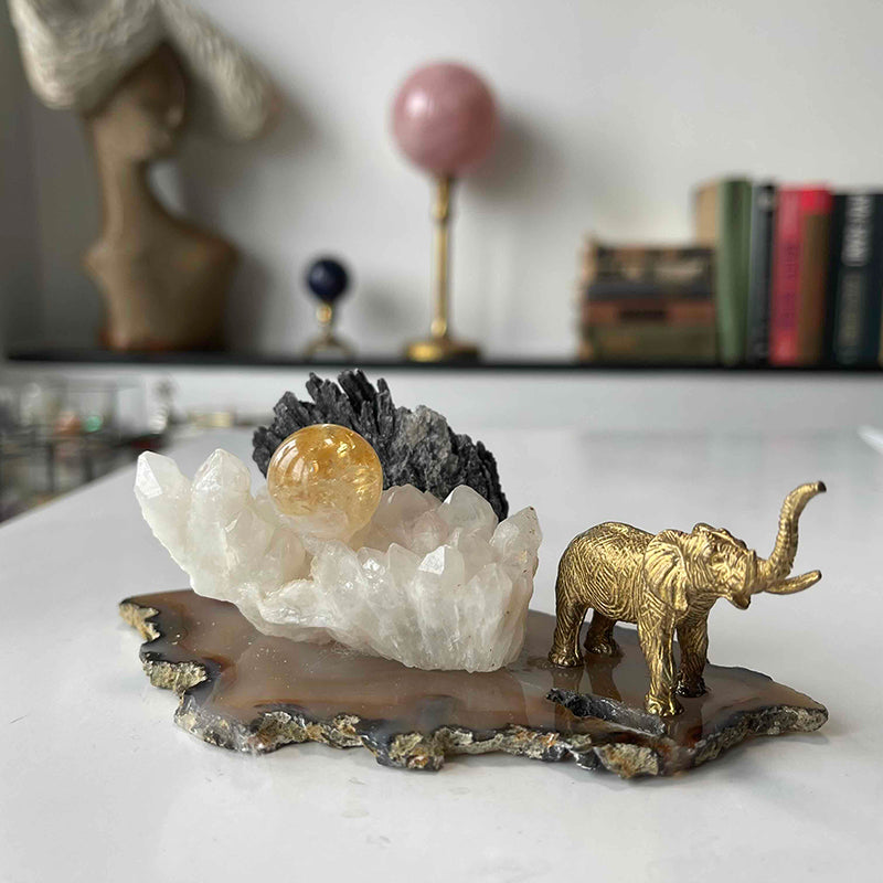 Akik tabaka üzerinde kanat formunda Kyanit, Kristal Kuvars ve Sitrin küre. Yanında pirinç fil figüründen oluşan bu tasarım kişisel gelişim, bolluki, bereket ve iyi şans vaad ediyor ...