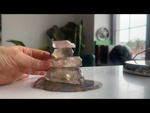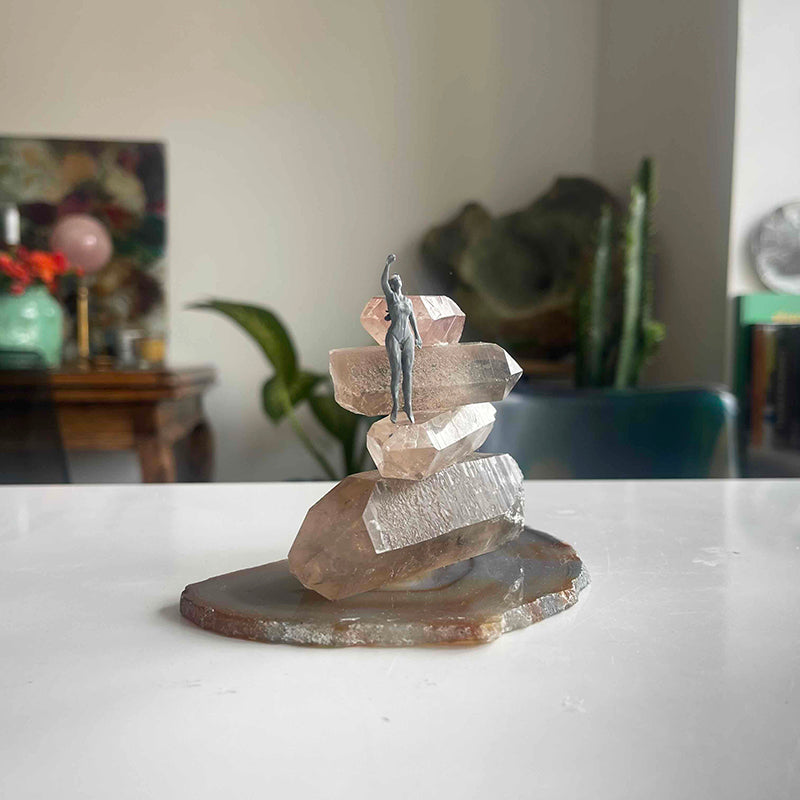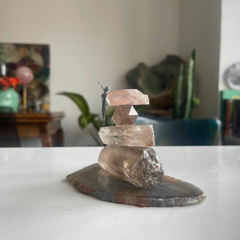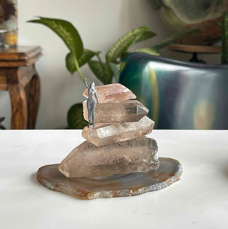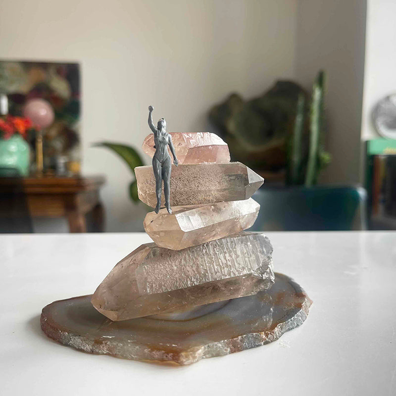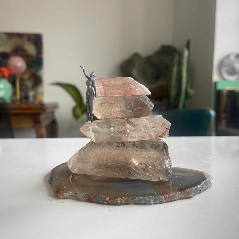 Akik kristali üzerinde, üst üste çeşitli ebatlarda Dumanlı Kuvars kristalleri ve elini kaldırmış bir kız figürü.