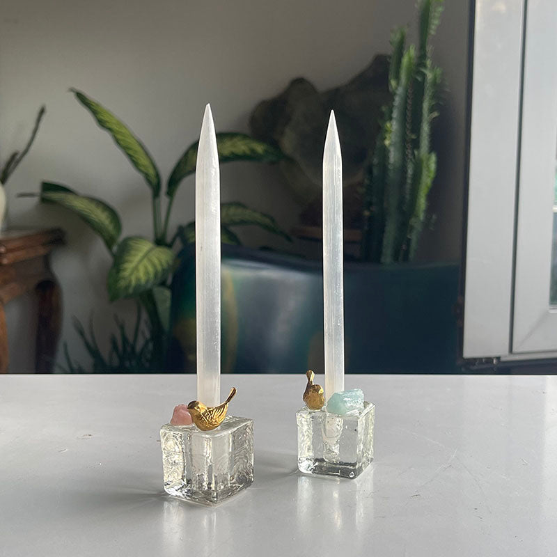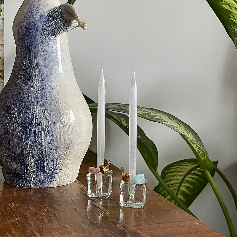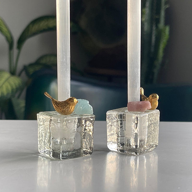 Dekoratif cam mumluklar, pirinç kuş figürleri, Akuamarin ve Pembe Turmalin ile süslenmiş. Mum efekti veren Selenit çubuklar ile tamamlanmış...