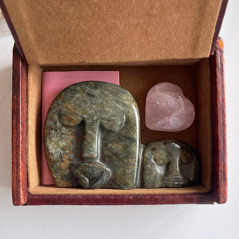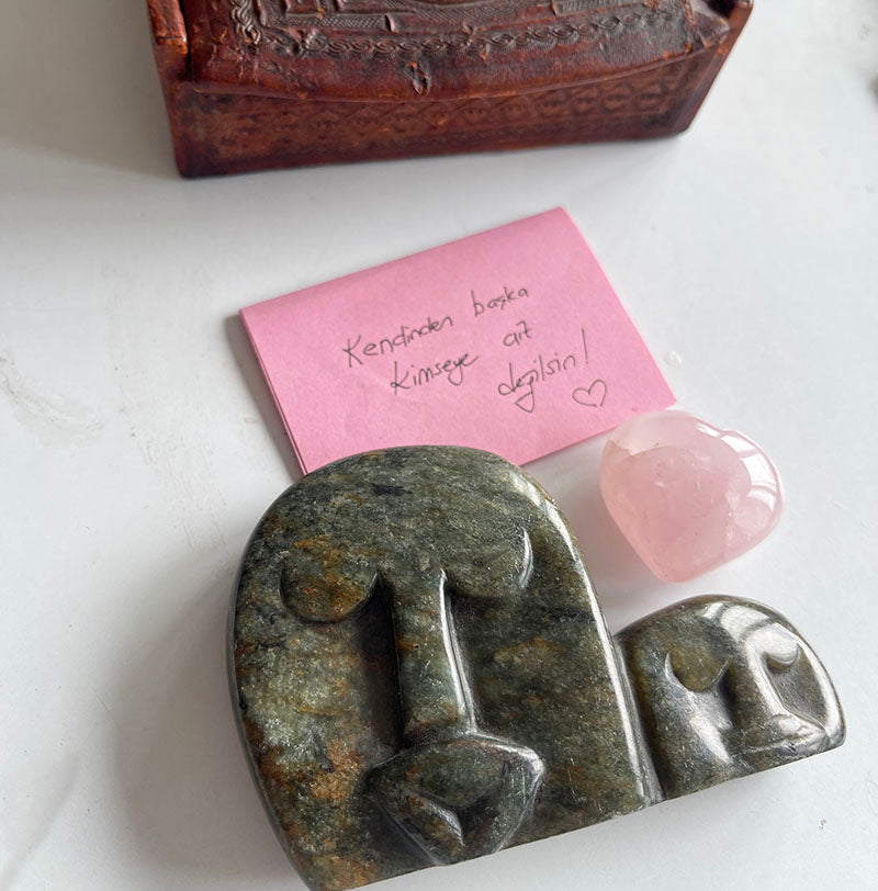 Kutunun içinde bulunan kalp formundaki Pembe Kuvars, sevgi ve şefkatin taşı olarak bilinir. Bu taş, duygusal dengeyi sağlarken, sevgi dolu ilişkilerin pekişmesine yardımcı olur. Pembe kuvars, kalp kırıklıklarını onarmak ve içsel huzuru sağlamak için idealdir. Bu nedenle, kutu sadece fiziksel bir anı saklamakla kalmaz, aynı zamanda sevgi dolu bir enerji kaynağı sunar.