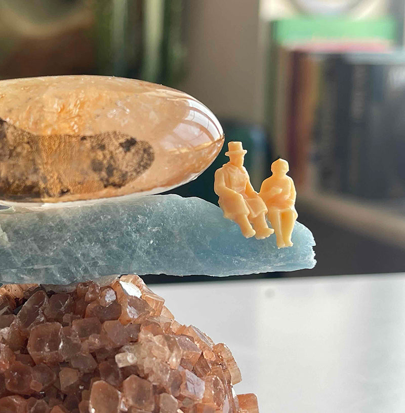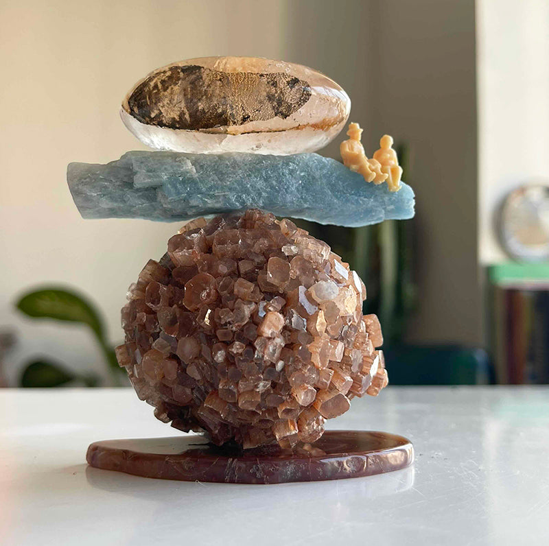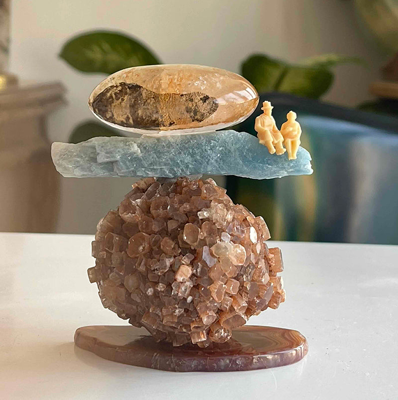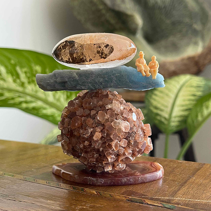 Bu kristal heykeli, Akik kaide üzerine oturtulmuş küre formunda Aragonit, Mavi Kyanit ve oval formda Kristal Kuvars ile bir araya geliyor. Heykelin en dikkat çekici özelliği ise Mavi Kyanit'nin ucunda, yan yana oturmuş, sevgi dolu bir çift.