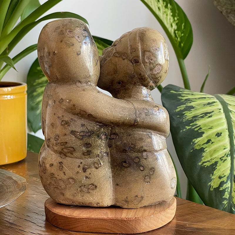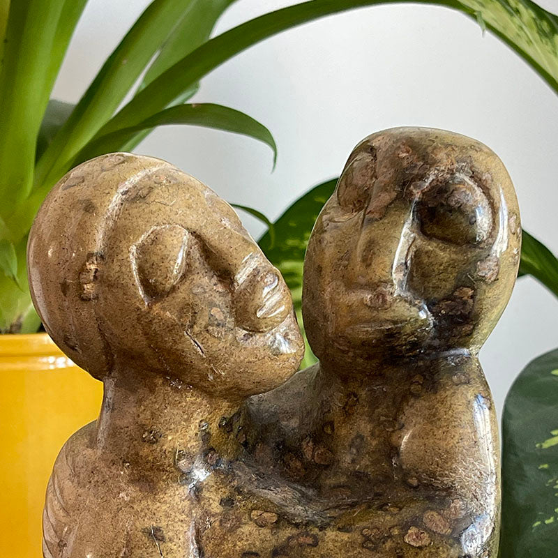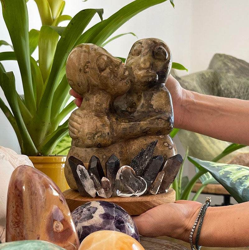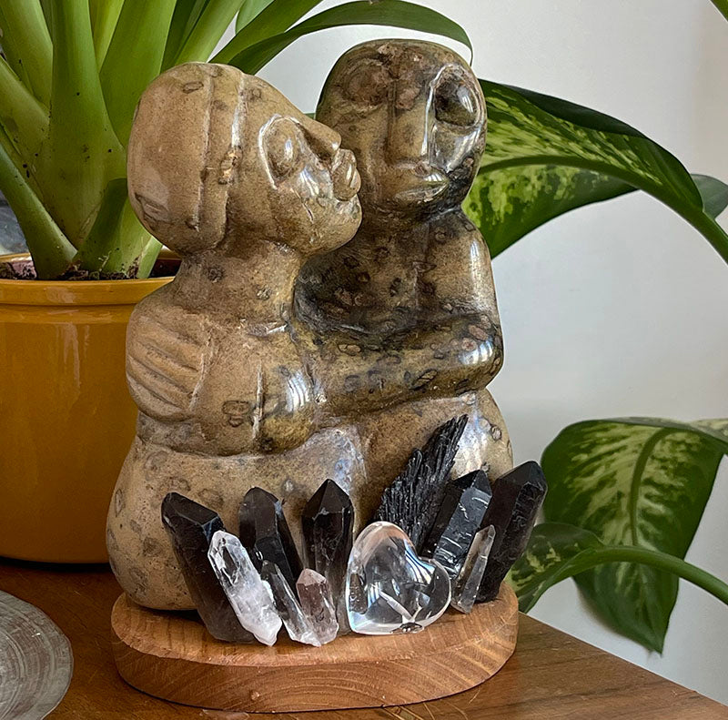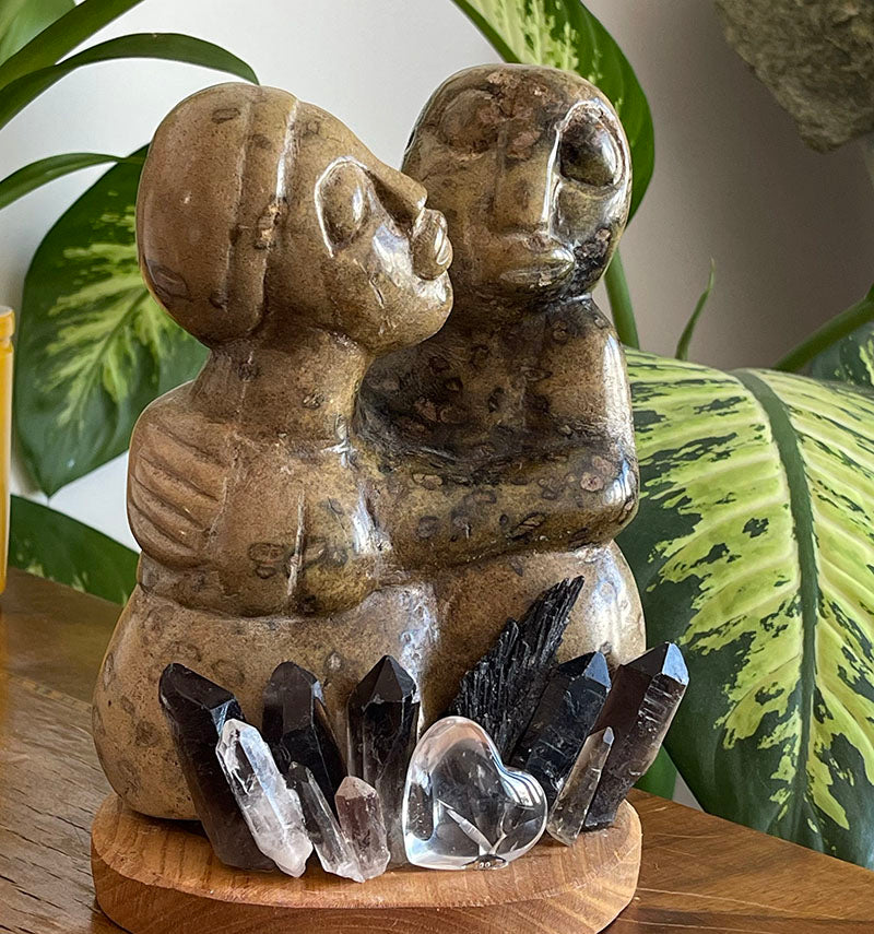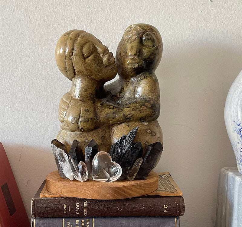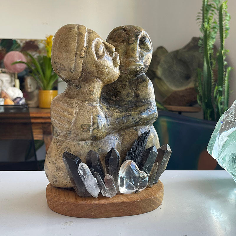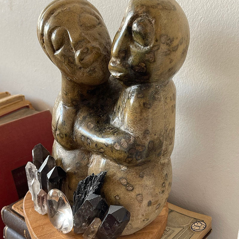 Afrikalı bir sanatçının elinden çıkan bu taş heykel, aşk ve uyumun özünü yansıtan eşsiz bir eserdir. Leopar taşından yontulan heykel, aşkı, sadakati, sevginin gücünü ve istikrarı simgeler. Heykelde tasvir edilen çiftin ayaklarının dibinde Dumanlı Kuvars, Kristal Kuvars ve Kyanit taşları yer alır ve her biri bu esere kendine özgü enerjilerini katar.