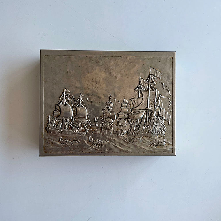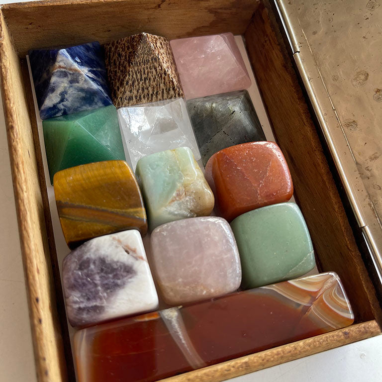 Dışı metal kaplamalı, içi ahşap bu antika kutunun içinde, 13 kristal taş bulunur: