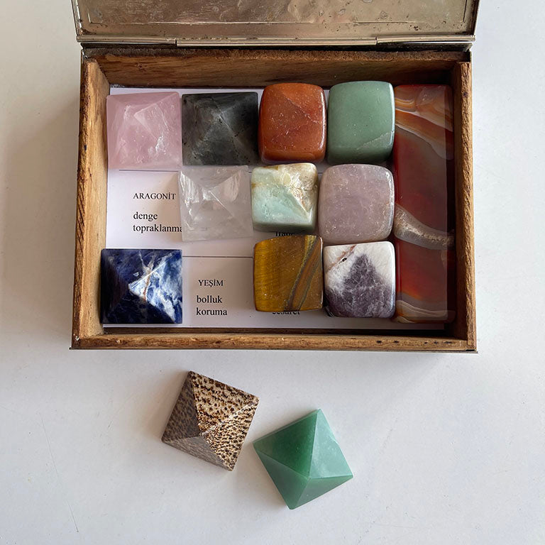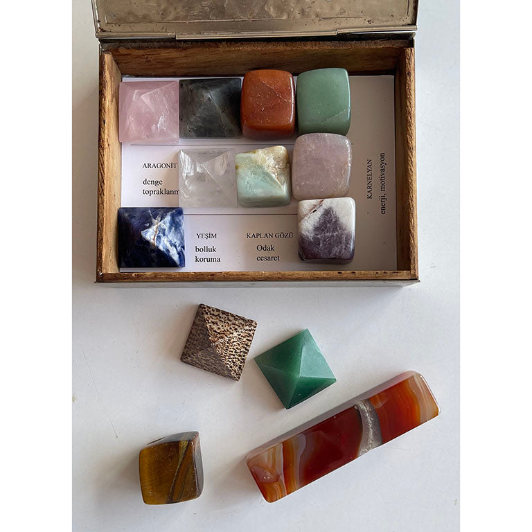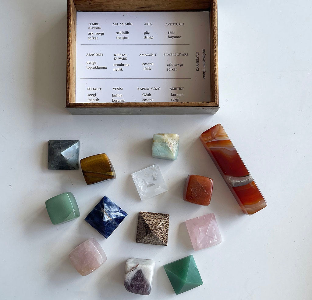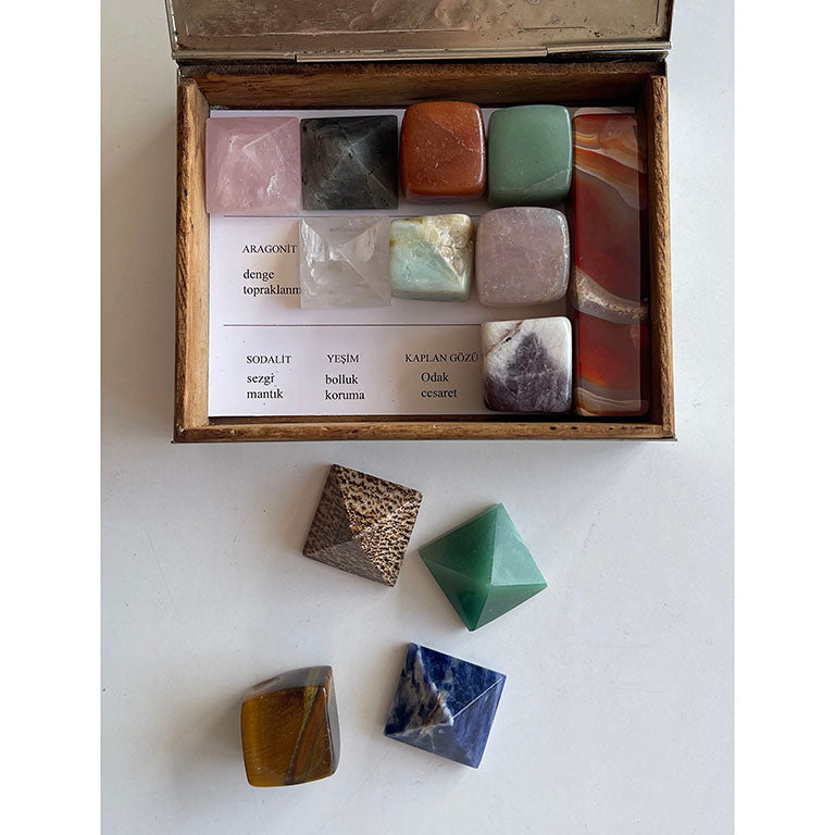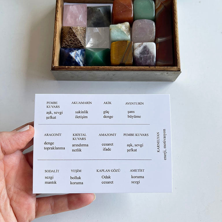 Her biri farklı etkiye sahip bu kristallerin; isimleri ve etkileri yazılı halde kutunun içindedir. Göreviniz basit ama dönüştürücü: Taşları, isimlerine ve anlamlarına göre ait oldukları yere yerleştirmek.