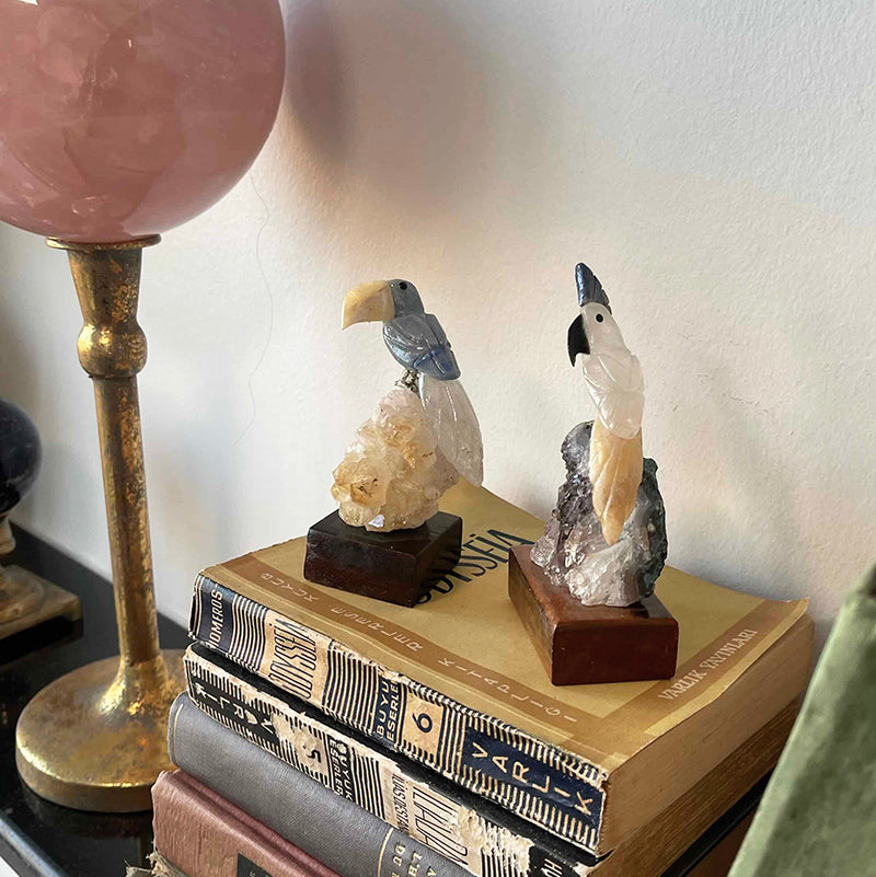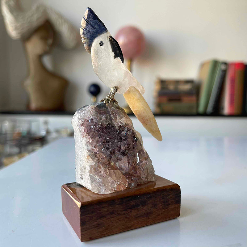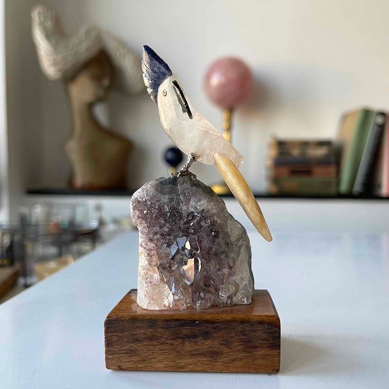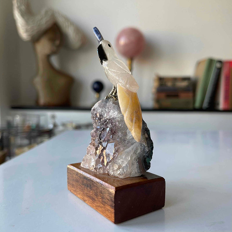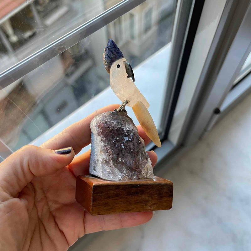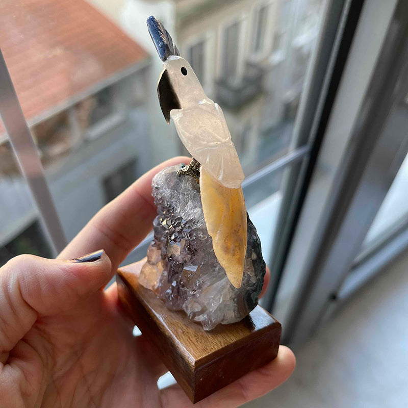 Ametist kaya üzerinde büyüleyici Kristal Kuvars gövdesi, enerjisiyle çevresine ışık saçan Sarı Kalsit kuyruğu ve başının üstündeki gökyüzü mavisi Sodalit tüyleriyle, bu el yapımı Papağan heykeli, adını Brezilya mitolojisindeki zaman tanrıçasından alıyor.