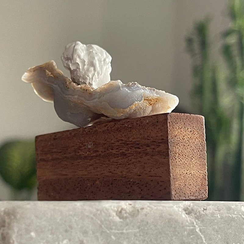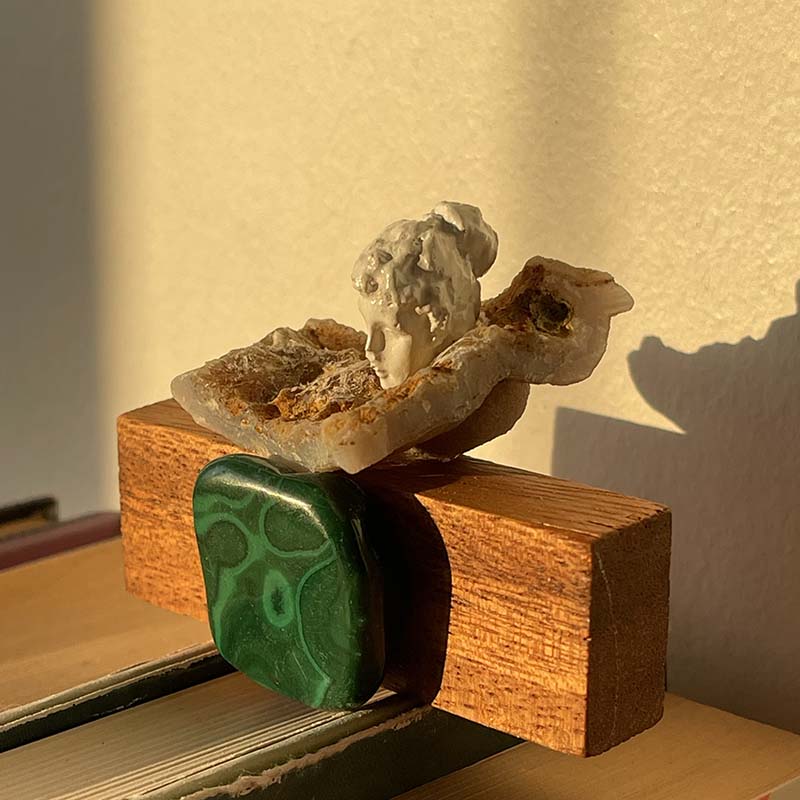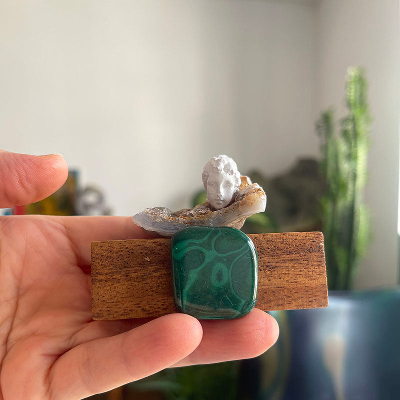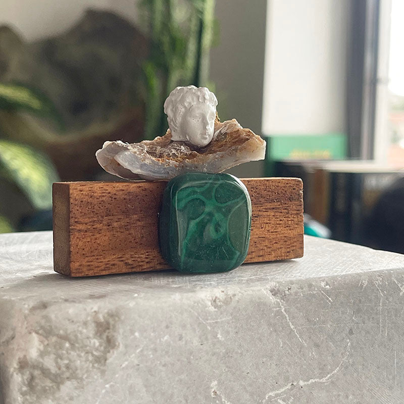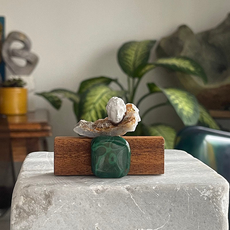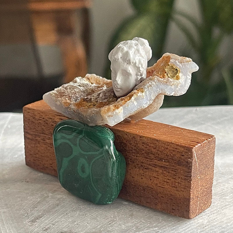 Bu dekoratif çalışma, ahşap bir blok üzerine yerleştirilmiş yemyeşil kare formda muhteşem bir Malakit ile başlar. Üzerinde doğal dağınık formuyla Kalsedon Kristali ve üstünde zarif bir kadın büstü bulunur.